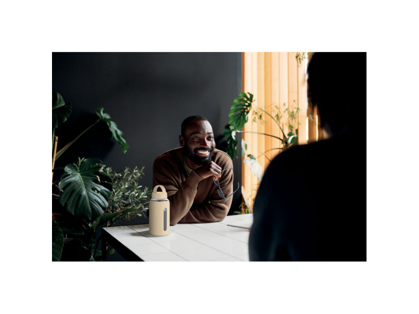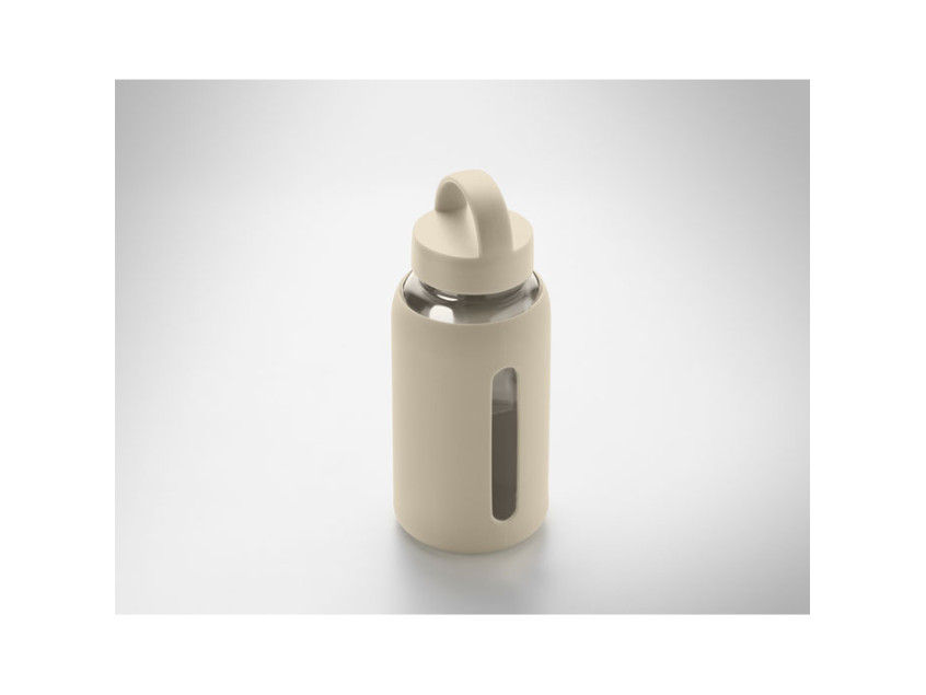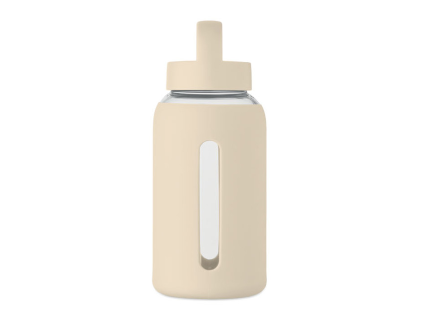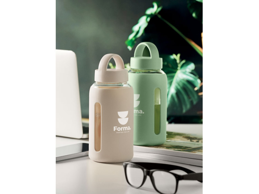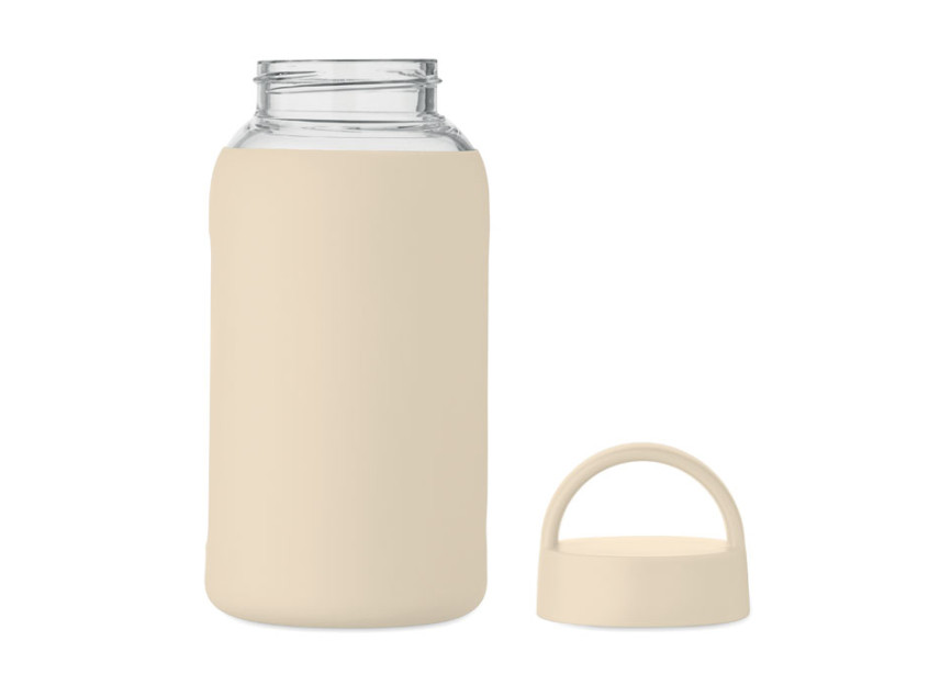 Бутылка из прочного боросиликатного стекла с силиконовым чехлом и крышкой с ручкой. Объем: 600 мл.