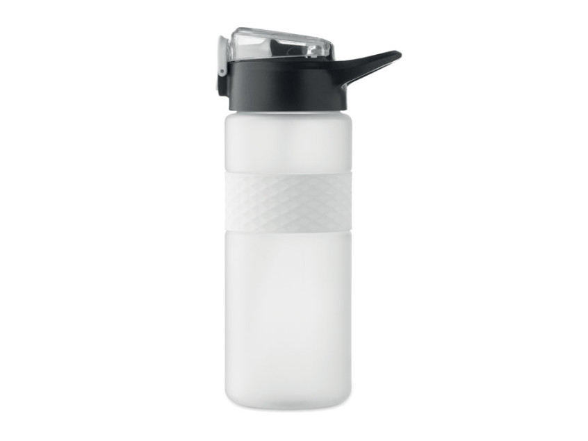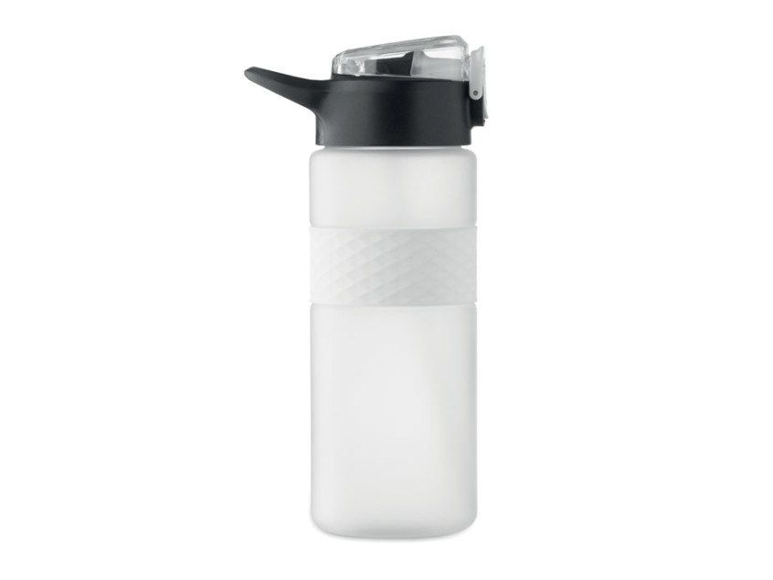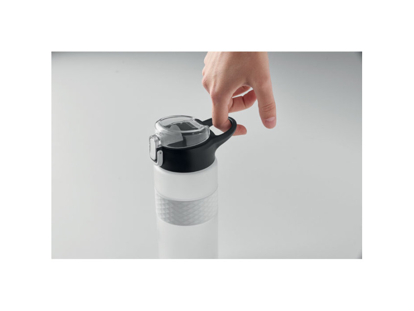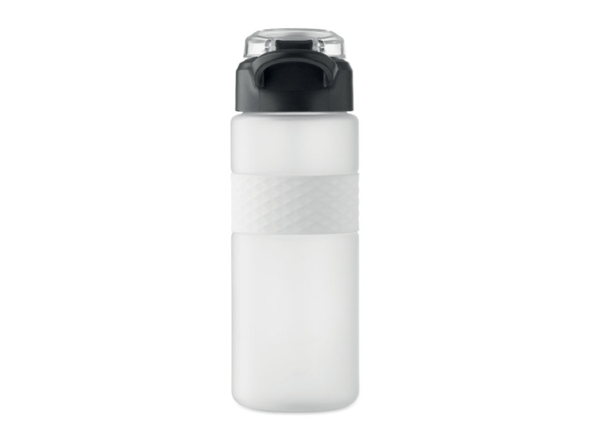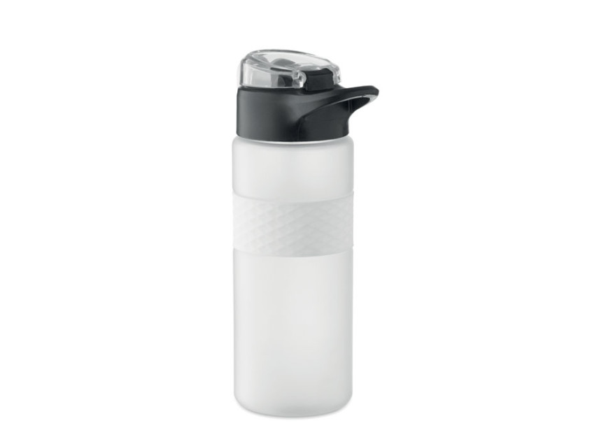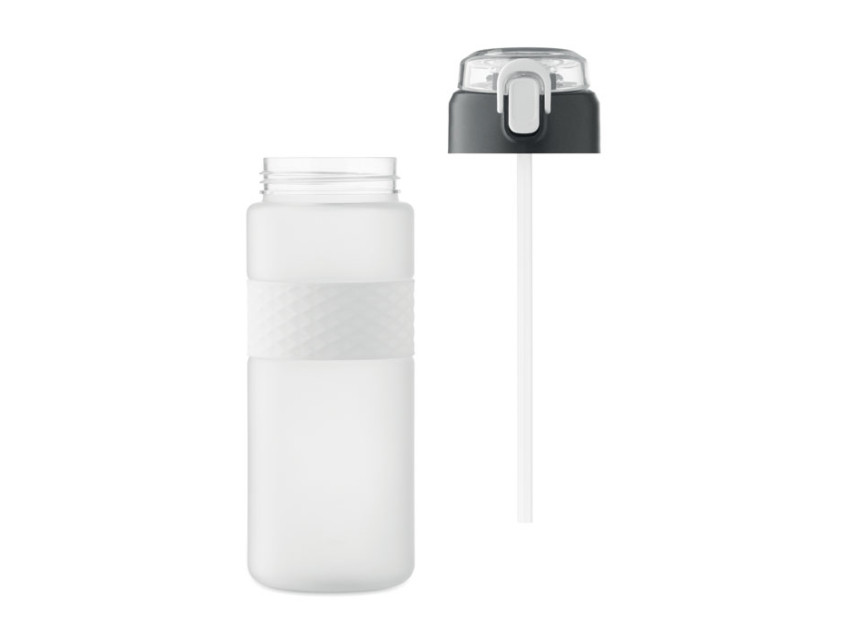 Drinking bottle made from RPET with silicone grip, PP flip-top lid and safety lock. Including integrated straw. Leak-free. Capacity: 700 ml.