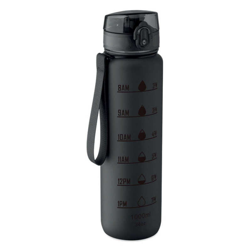 Sports water bottle in RPET, motivational time markings, one hand opening flip top lid, safety lock and carrying strap. Leak-free. Capacity: 1L.