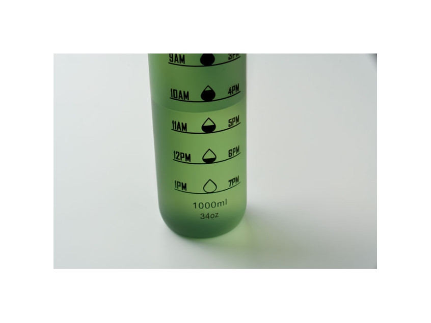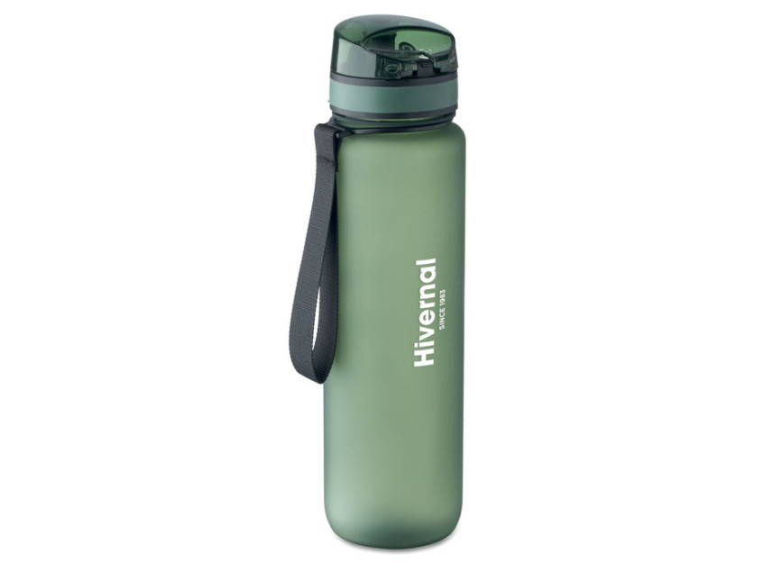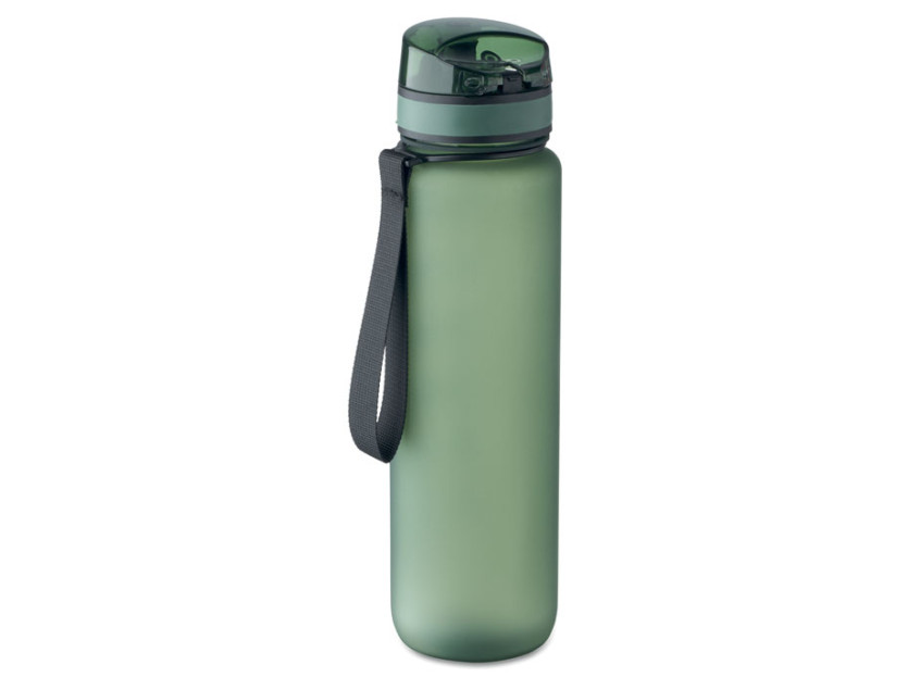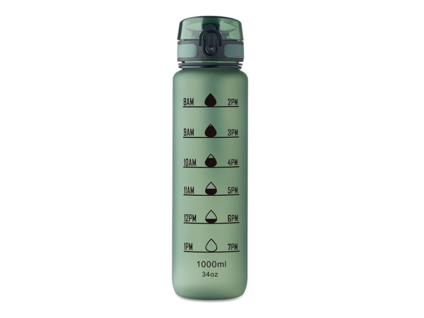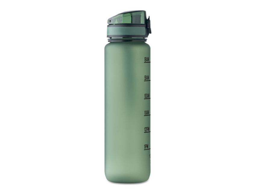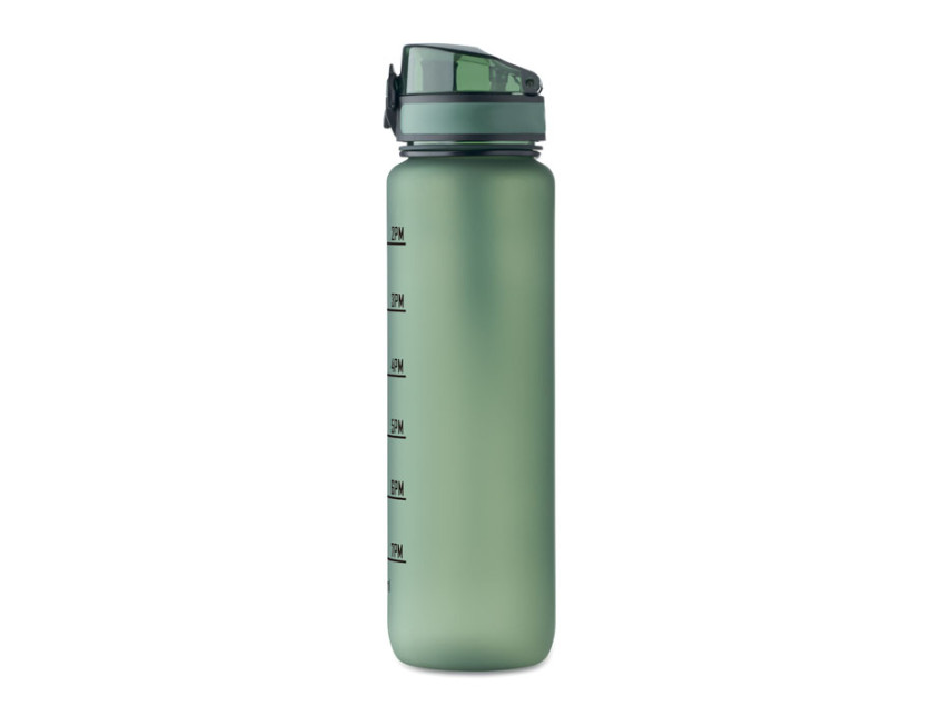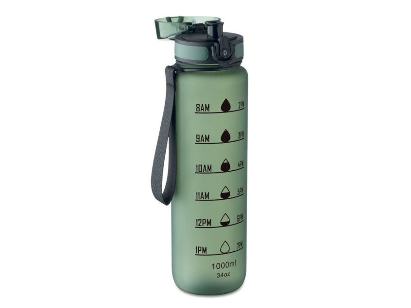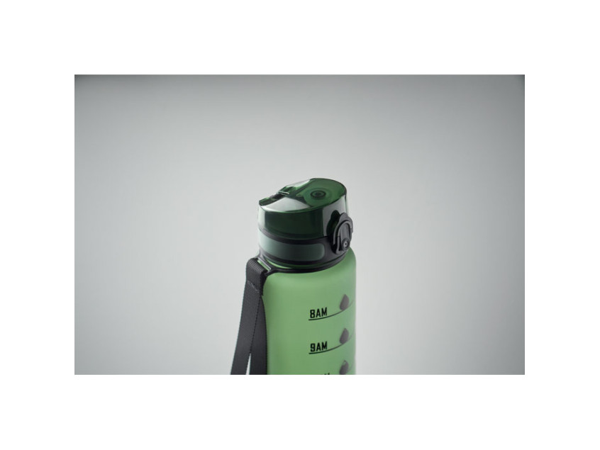 Sports water bottle in RPET, motivational time markings, one hand opening flip top lid, safety lock and carrying strap. Leak-free. Capacity: 1L.