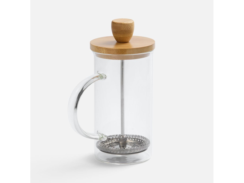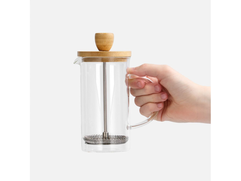 Френч-пресс с изящным сочетанием прозрачного боросиликатного стекла и натурального дерева — это не просто чайник, а стильный акцент на кухне.