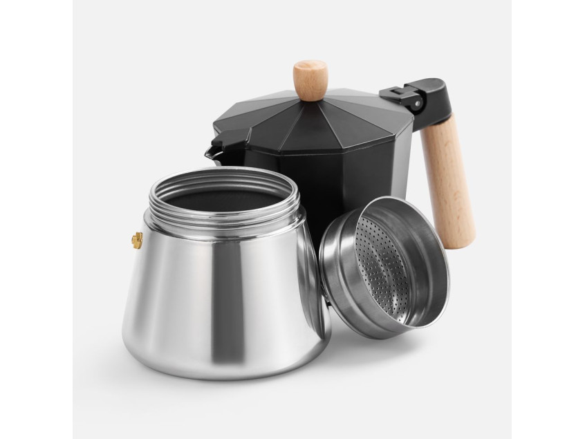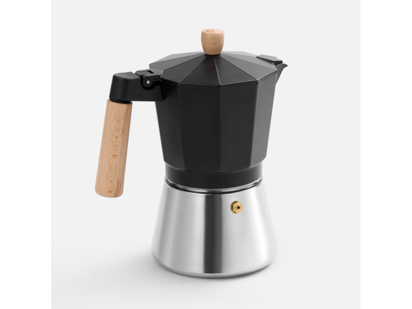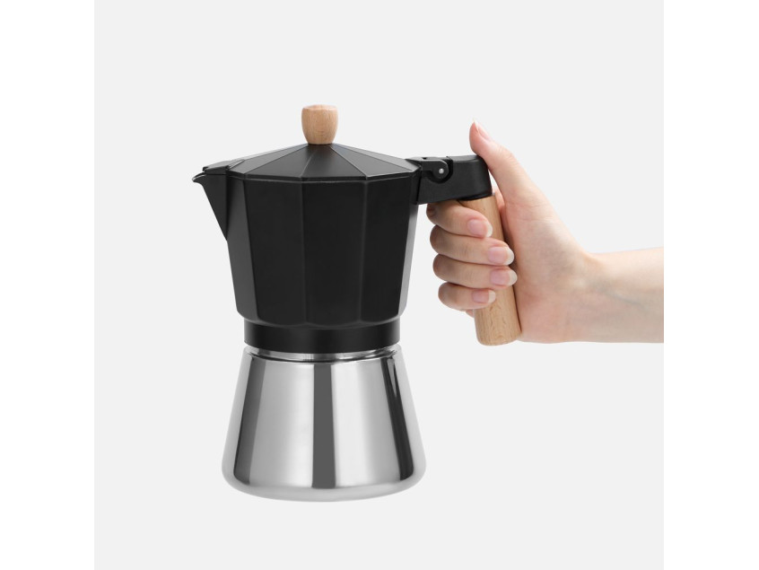 Верхняя часть выполнена из окрашенного алюминия, а нижняя — из нержавеющей стали с зеркальной полировкой, что обеспечивает долговечность и стильный внешний вид. Удобная деревянная ручка не нагревается, гарантируя комфорт и безопасность при использовании. Эта кофеварка быстро и легко приготовит классический эспрессо, позволяя сполна наслаждаться свежим крепким кофе.