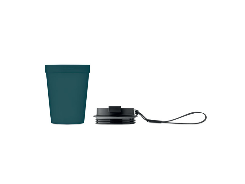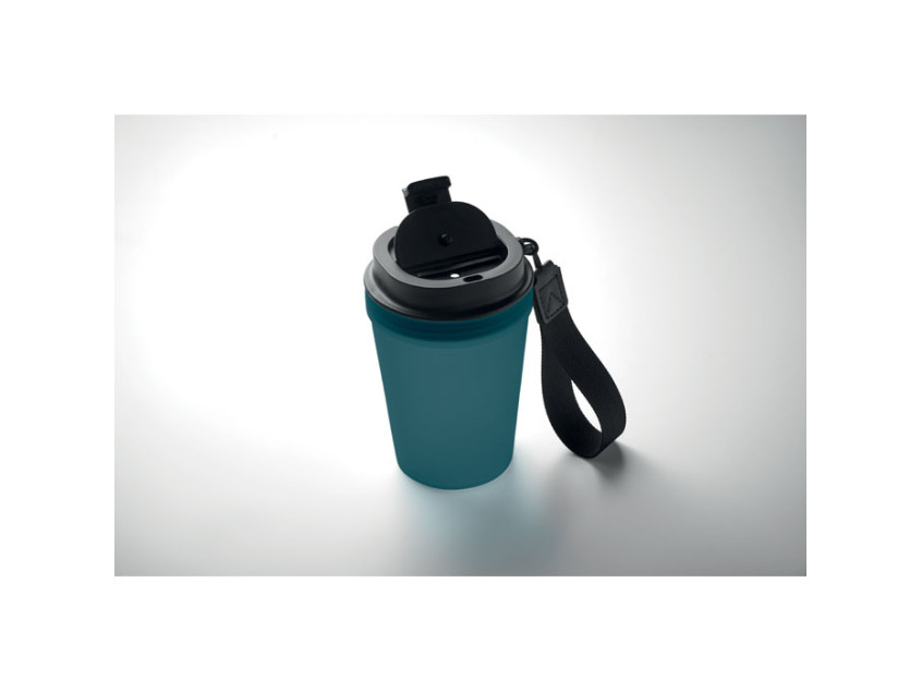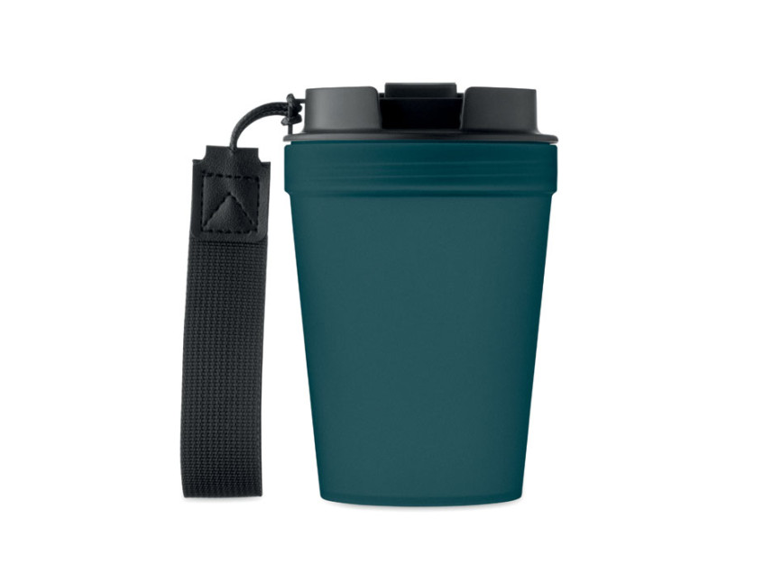 Single wall tumbler in PP, with RPET polyester strap. Leak-free. Capacity: 300 ml. As this is a single walled tumbler, heat transfer can still occur.