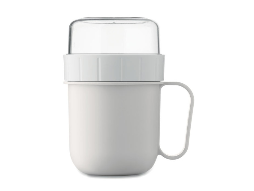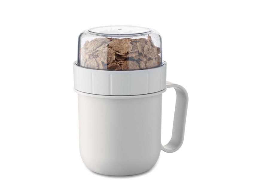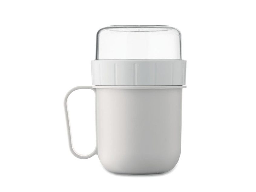 Breakfast or brunch on the go cup in PP and PS lid container. Consists of 2 individual containers to keep ingredients separate. Capacity: 450 ml and 160 ml. Leak-free.