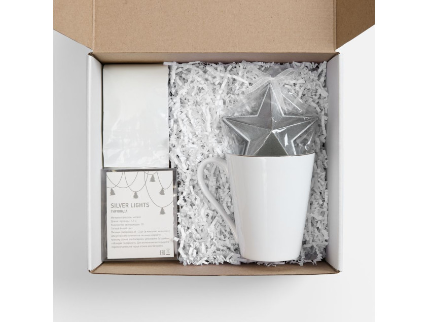 Материал:кружка - костяной фарфор; гирлянда - пластик, металл; свеча - парафин; ежедневник - искусственная кожа; ручка - металл