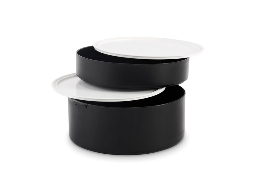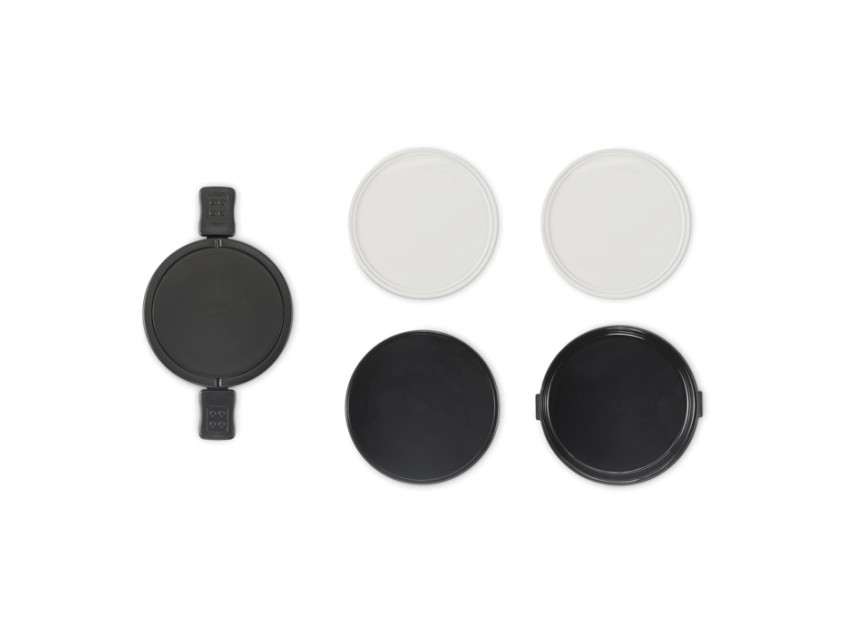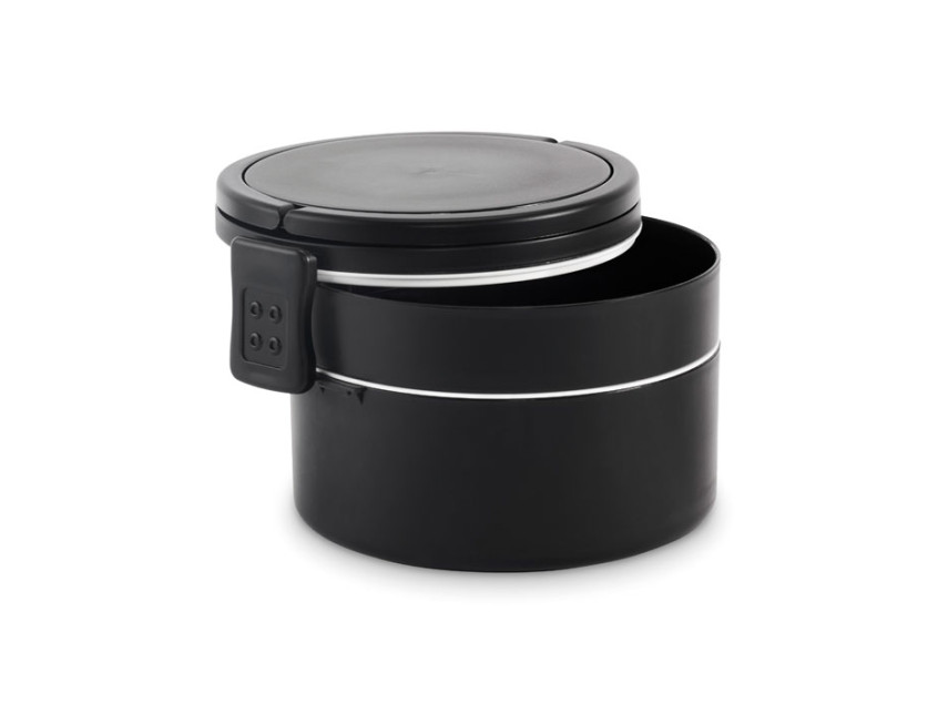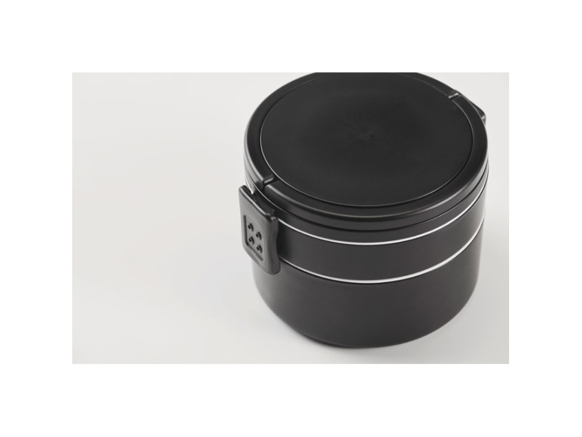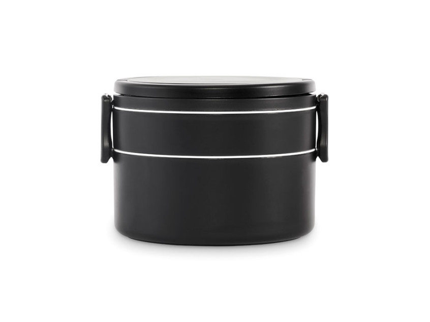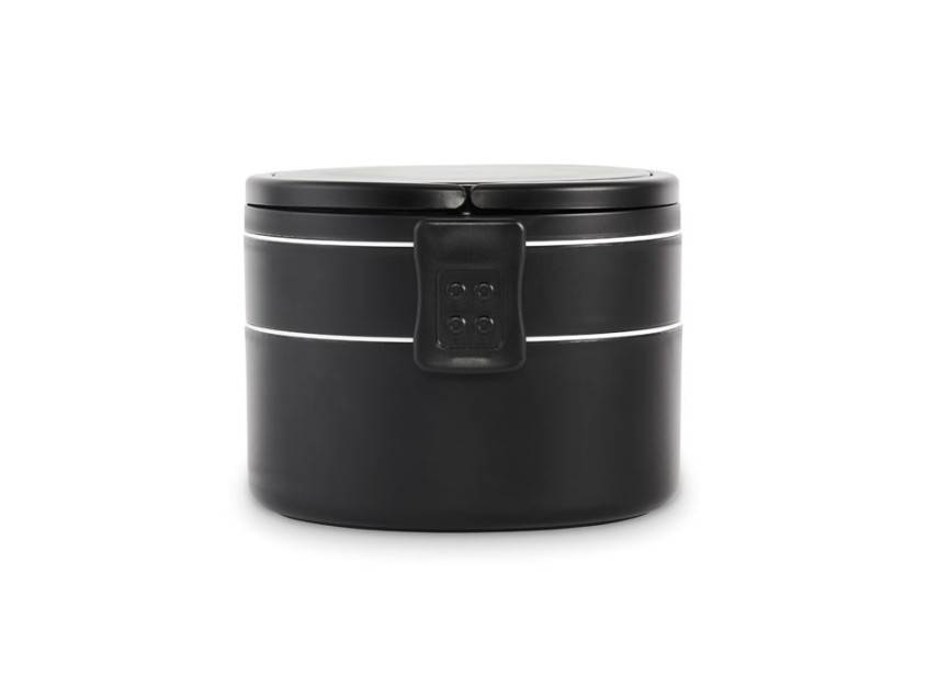 Двухъярусный круглый ланчбокс из полипропилена с боковой застежкой-клипсой и ручками. Есть внутренние крышки белого цвета. Объем: верхняя часть 250 мл, нижняя часть 700 мл.