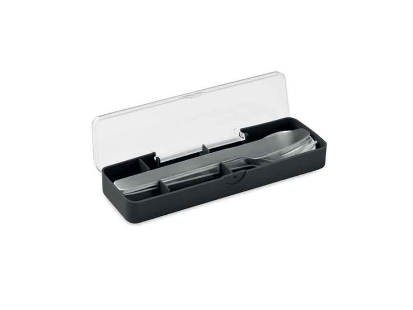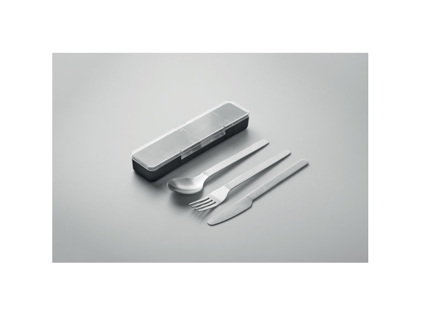 Набор столовых приборов из нержавеющей стали в полипропиленовом футляре. В набор входят вилка, нож и ложка.