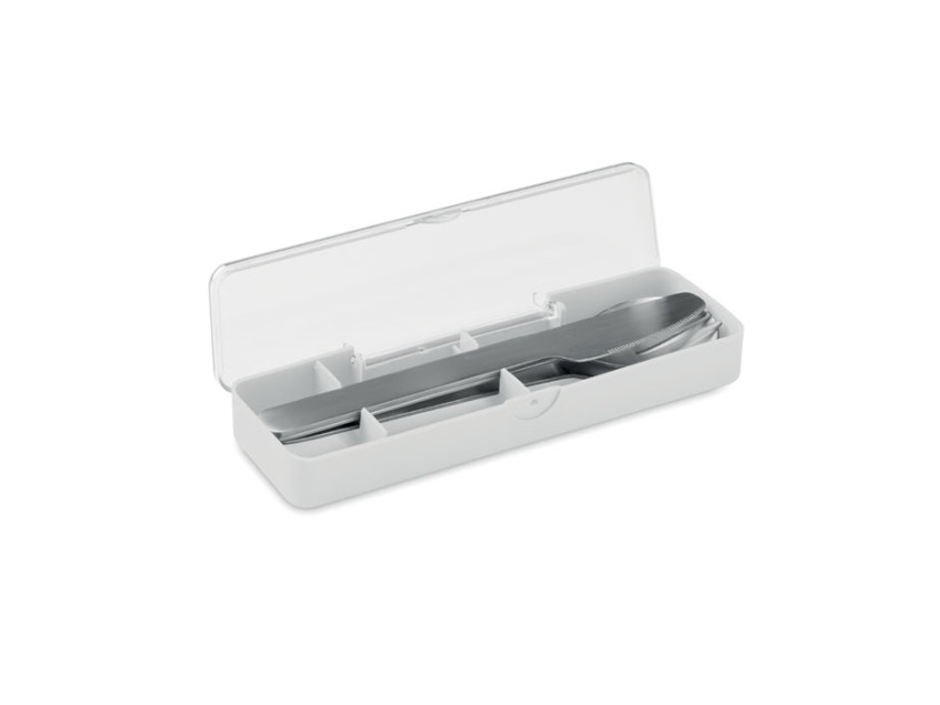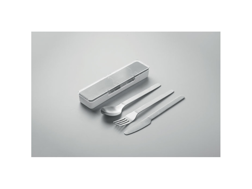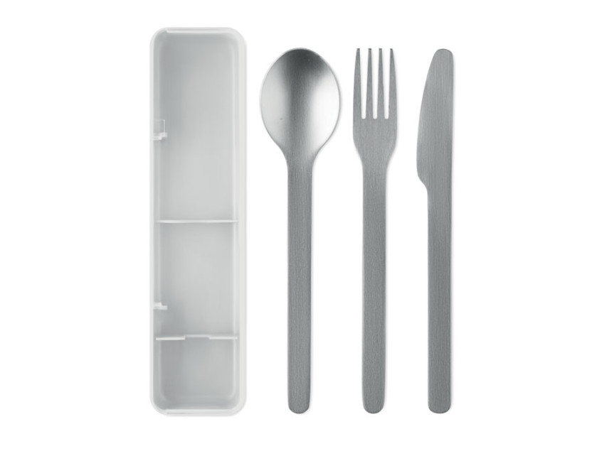 Набор столовых приборов из нержавеющей стали в полипропиленовом футляре. В набор входят вилка, нож и ложка.