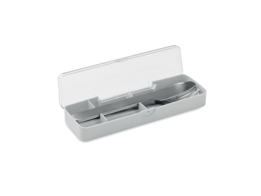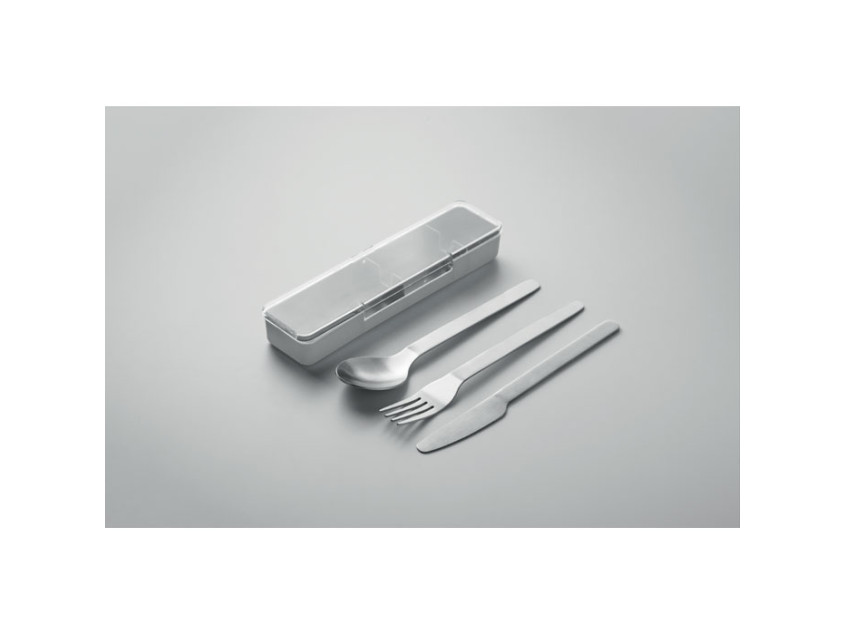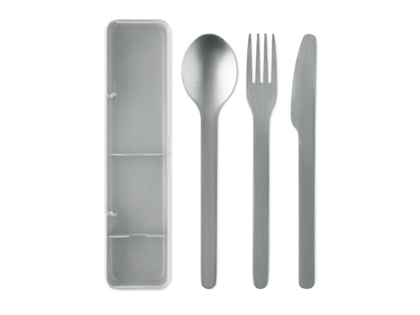 Набор столовых приборов из нержавеющей стали в полипропиленовом футляре. В набор входят вилка, нож и ложка.