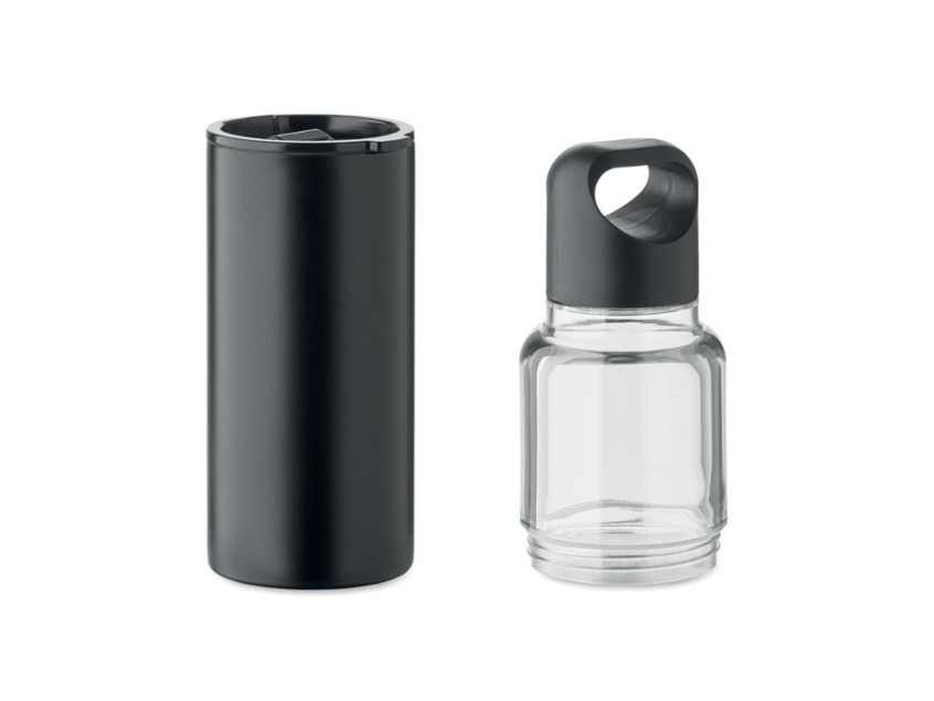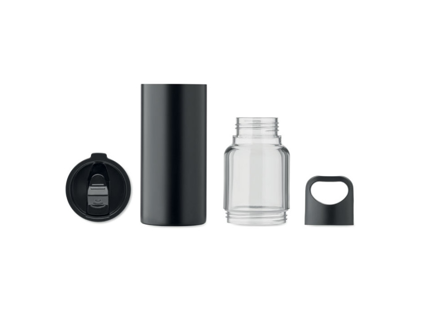 Бутылка из тритана и термостакан с двойными стенками из 90% переработанной и 10% нержавеющей стали. 2 крышки из полипропилена. Общий объем 610 мл, стакан 350 мл.