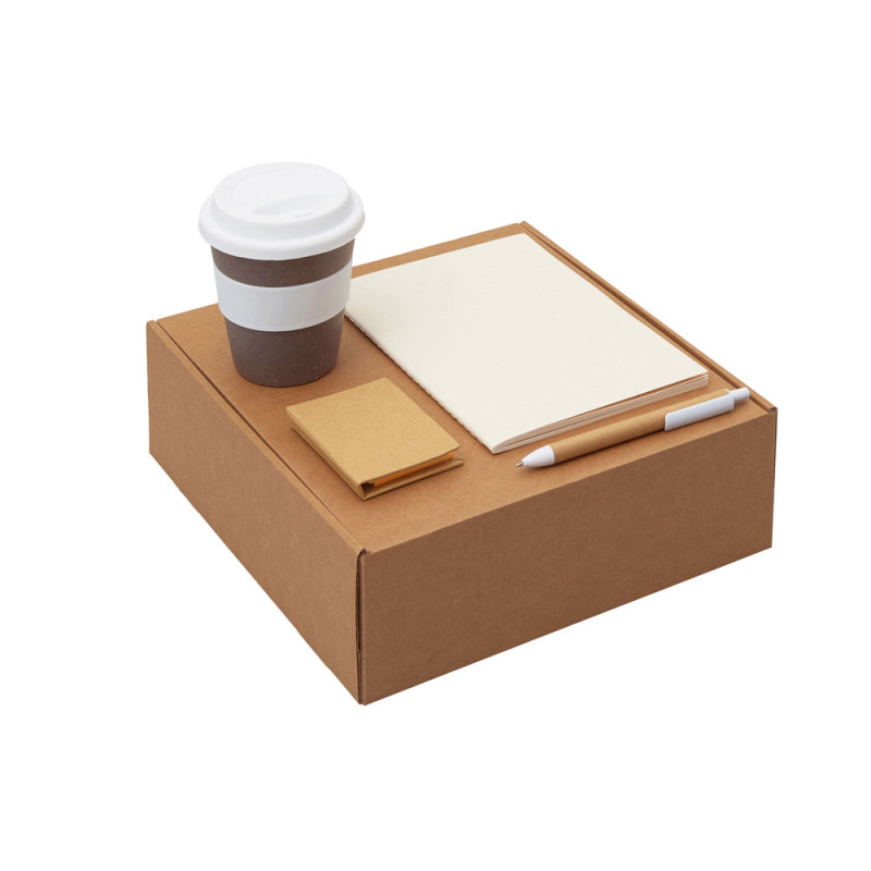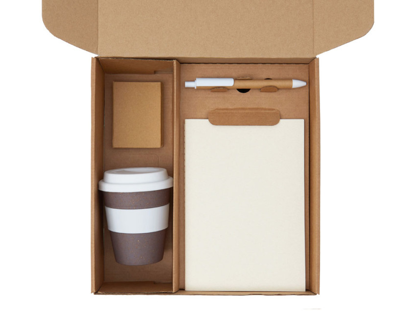 Материал: | блокнот- бумага из переработанных тетра-паков, ручка- картон,пластик, стакан- 50% бамбуковое волокно, 50% полипропилен, коробка- картон |