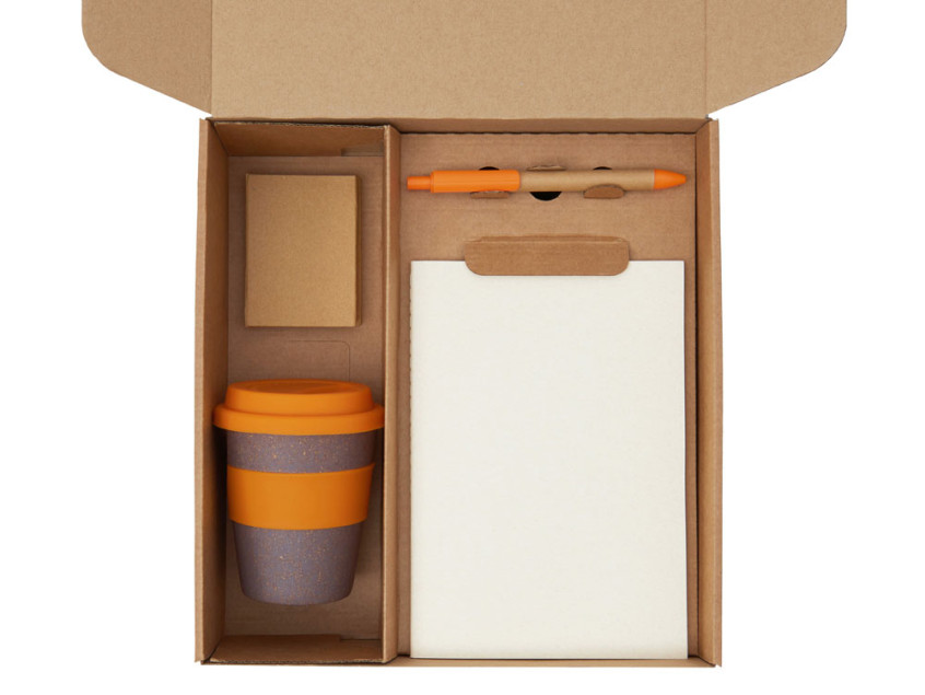 Материал: | блокнот- бумага из переработанных тетра-паков, ручка- картон,пластик, стакан- 50% бамбуковое волокно, 50% полипропилен, коробка- картон |