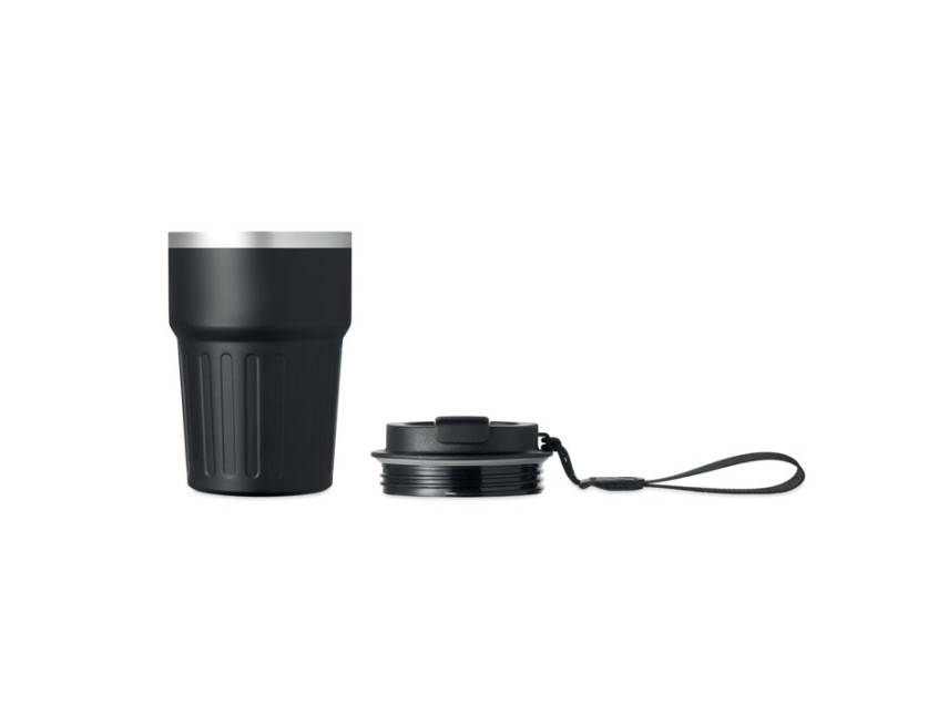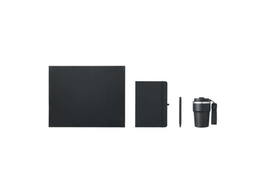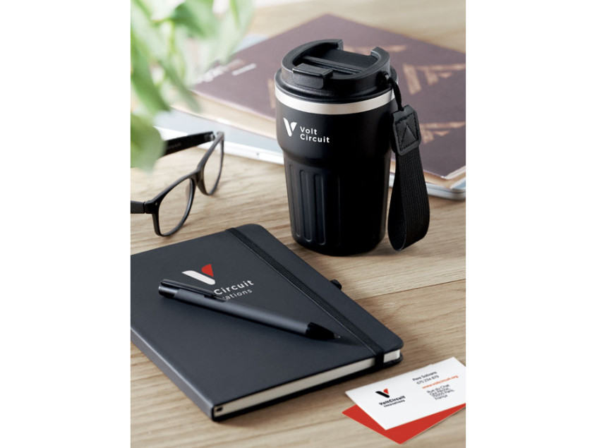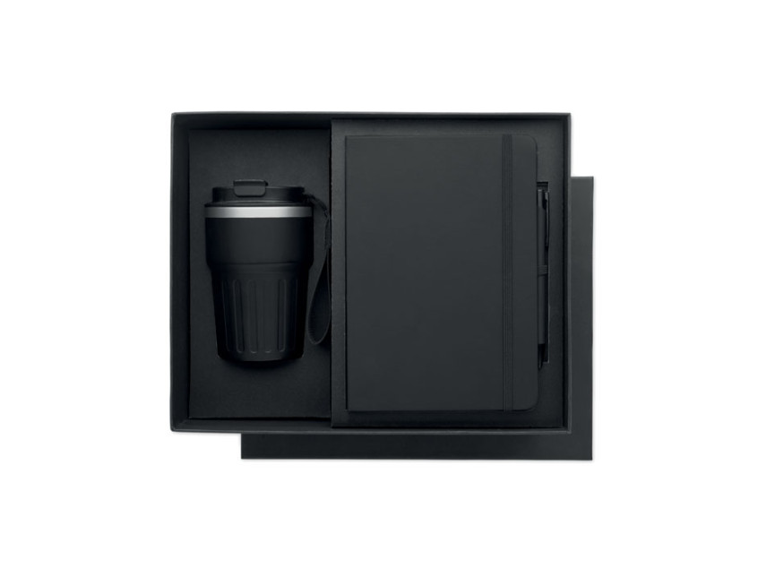 Блокнот А5, шариковая ручка из переработанного алюминия и термостакан из переработанной нержавеющей стали с двойными стенками 350 мл с крышкой из полипропилена и ремешком в подарочной коробке.