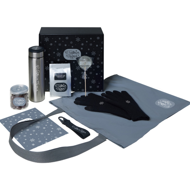 Материал:перчатки - 100% акрил; термос - нержавеющая сталь; ремувка - искусственная кожа, металл; сумка - полиэстер; открытка - бумага; мешок - нетканый материал