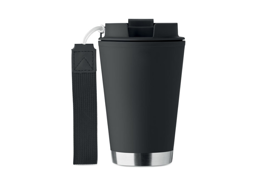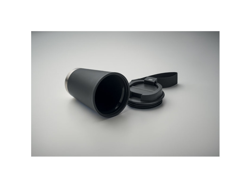 Double wall tumbler in PP inner wall, recycled PP outside wall, recycled stainless steel detail and RPET wrist strap. Capacity: 300 ml.