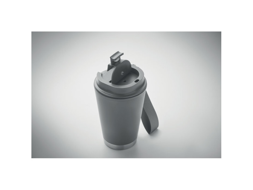 Double wall tumbler in PP inner wall, recycled PP outside wall, recycled stainless steel detail and RPET wrist strap. Capacity: 300 ml.