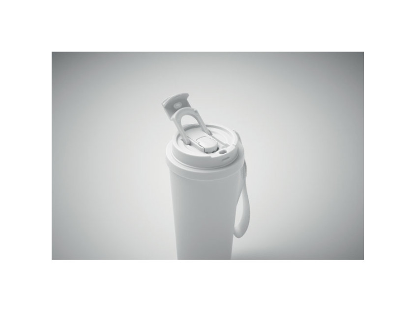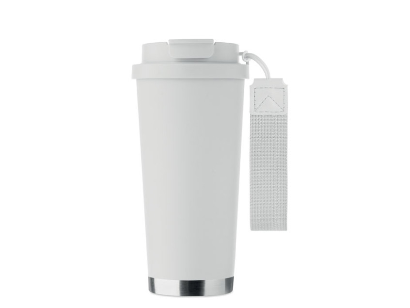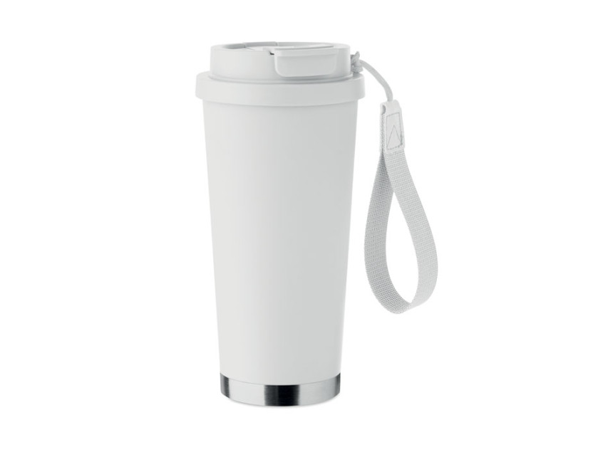 Double wall 90% recycled stainless steel (90% recycled stainless and 10% stainless steel) tumbler with PP lid (2-in-1 drinking sip and straw lid) and with RPET carry strap. Leak-free. Capacity: 500 ml.