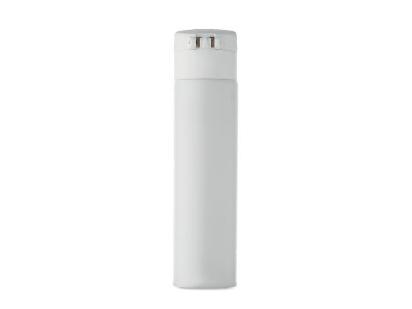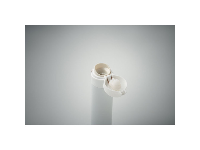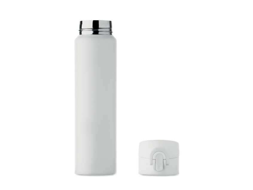 Double wall drinking bottle in recycled stainless steel (90% recycled stainless steel and 10% stainless steel) with security lock on the lid and press-to-open option. Leak free. Capacity: 300ml.