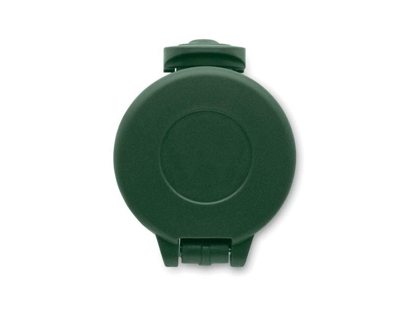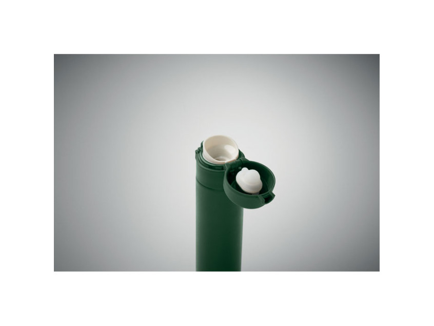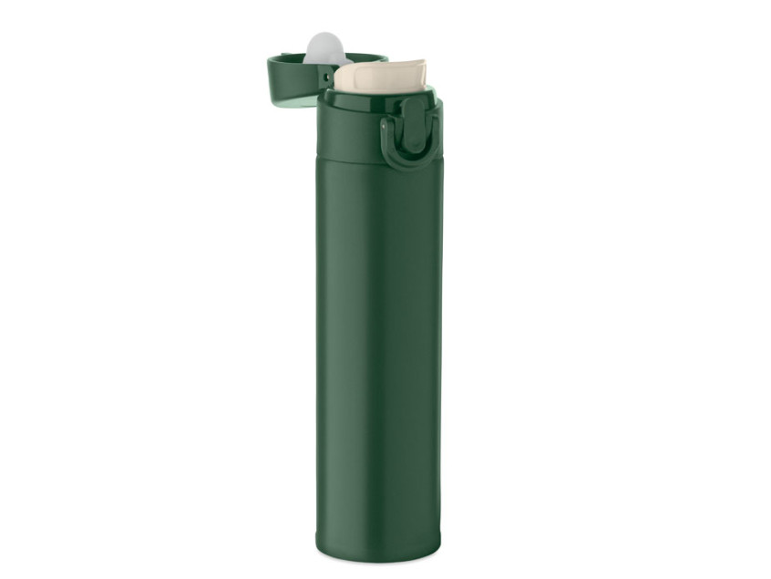 Double wall drinking bottle in recycled stainless steel (90% recycled stainless steel and 10% stainless steel) with security lock on the lid and press-to-open option. Leak free. Capacity: 300ml.