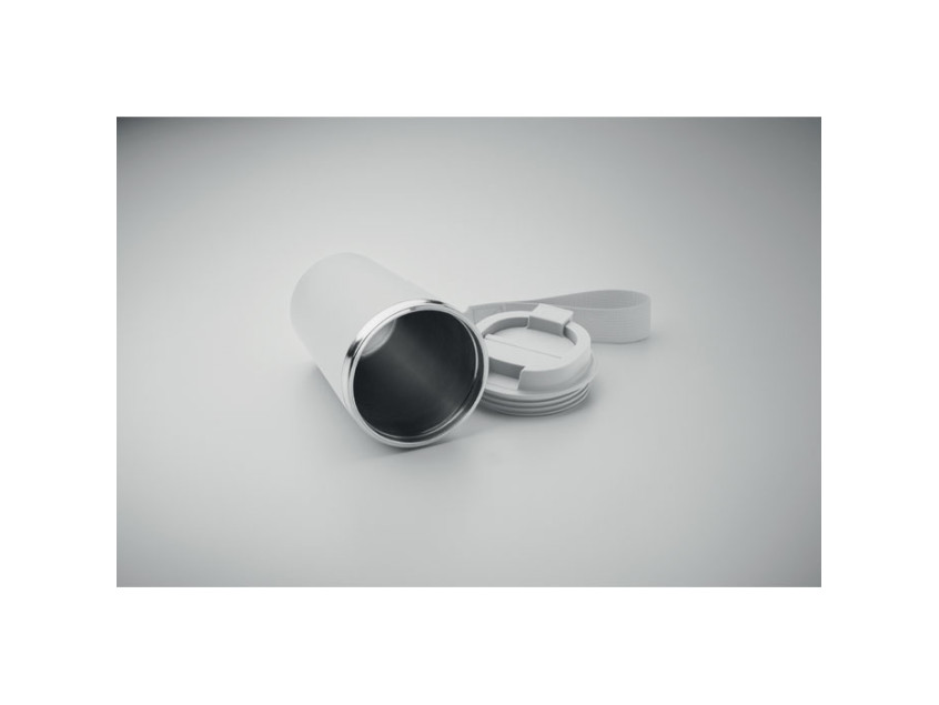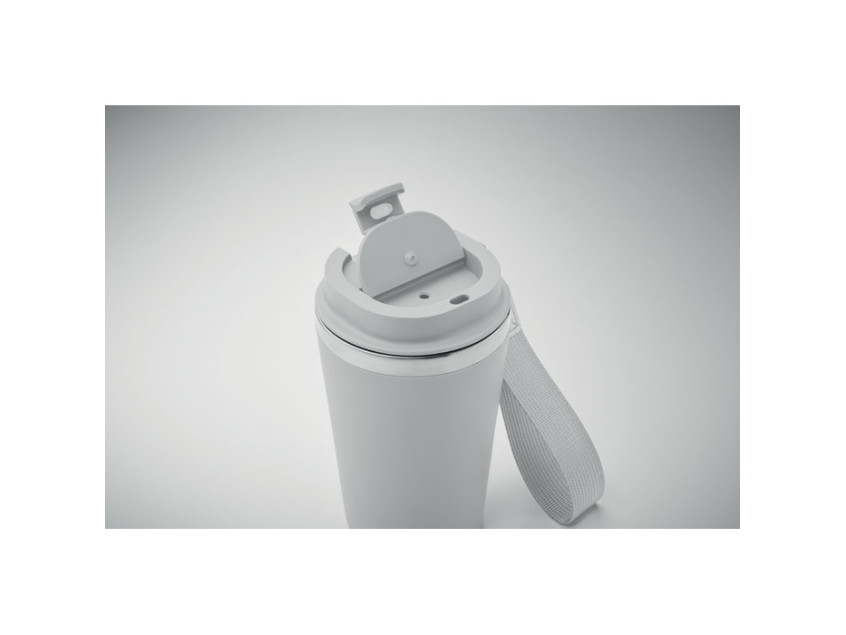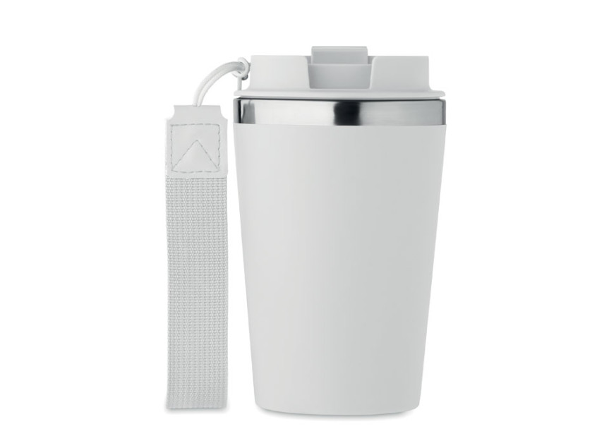 Ее двойные стенки из переработанной нержавеющей стали (90%) и обычной нержавеющей стали (10%) обеспечивают надежную термоизоляцию, сохраняя температуру напитка на несколько часов. Внешнее покрытие из переработанного полипропилена не только придает кружке стильный вид, но и делает ее легкой и удобной для повседневного использования. А ремешок для запястья из RPET добавляет практичности, позволяя брать кружку с собой куда угодно — на прогулку, в офис или в путешествие.