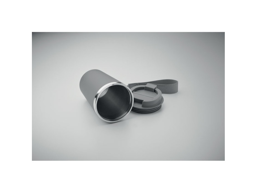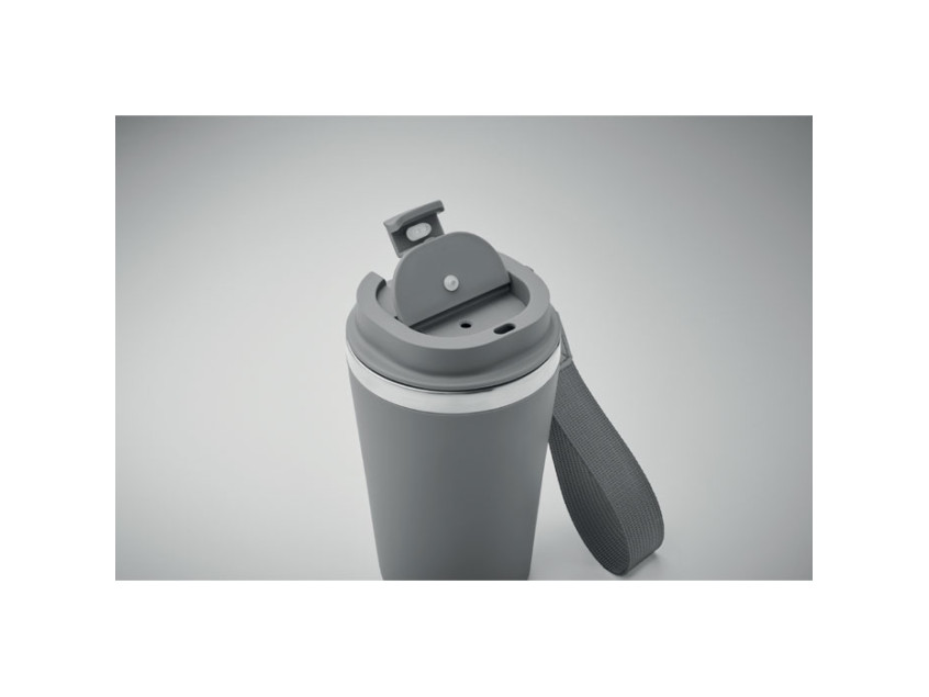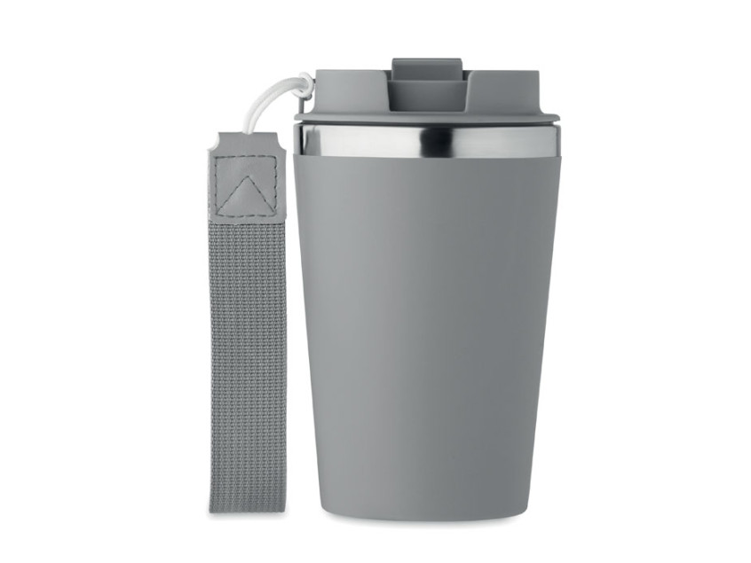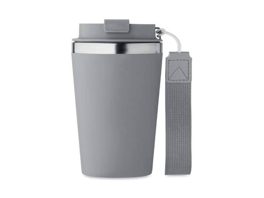 Каменный серый цвет придает кружке сдержанный и современный вид, который легко впишется в любой стиль — будь то деловая встреча, прогулка с друзьями или уютный вечер дома. Внешнее покрытие из переработанного полипропилена не только выглядит стильно, но и делает кружку приятной на ощупь. А ремешок для запястья из RPET добавляет удобства, позволяя носить термокружку с собой, не боясь уронить.