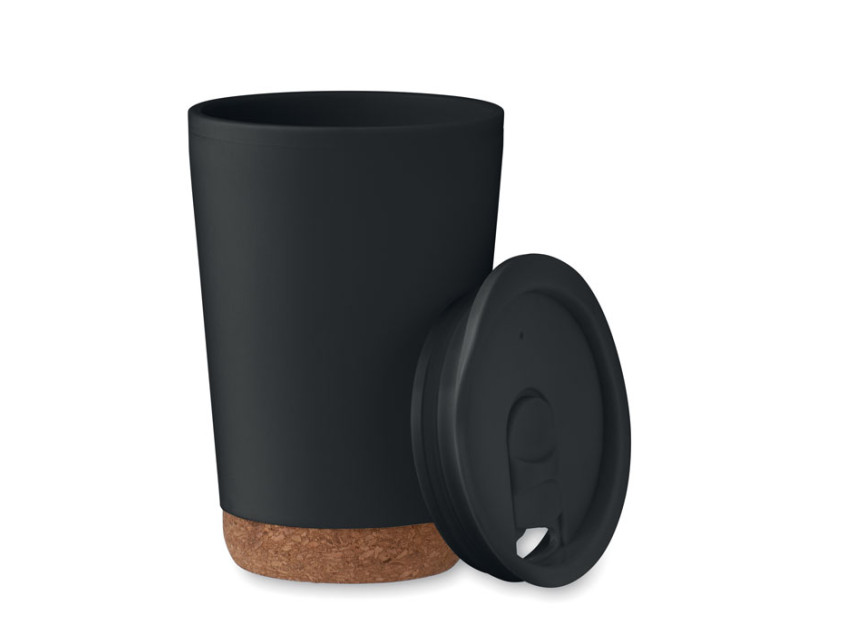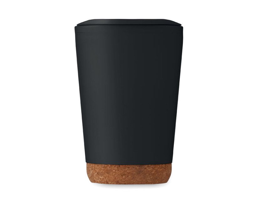Изготовленная из переработанного полипропилена, эта термокружка не только радует глаз, но и заботится о планете. Ее двойные стенки обеспечивают надежную теплоизоляцию, а пробковое основание добавляет изысканности и устойчивости. Черный цвет делает ее универсальным аксессуаром, который подойдет к любому образу – будь то деловой костюм, повседневный лук или спортивный стиль.