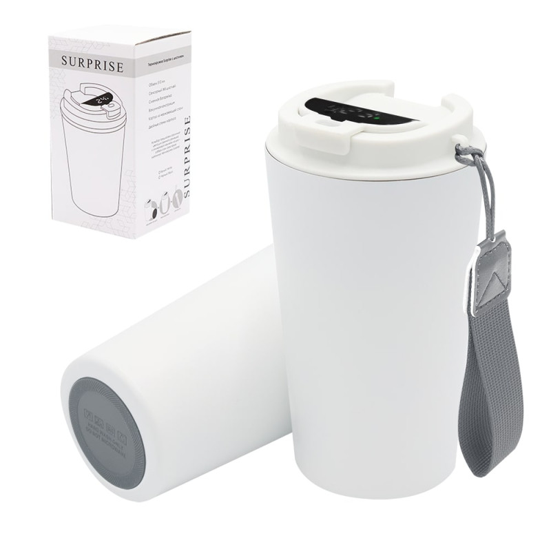Термокружка Surprise To Go с дисплеем выполнена из пищевой нержавеющей стали. Имеет двойные стенки с вакуумной изоляцией, а крышка изготовлена из пищевого безопасного для человека пластика. Термокружка Surprise To Go не только сохраняет ваши напитки горячими, но и показывает температуру напитка! Уникальная особенность данной термокружки – наличие сенсорного индикатора температуры, расположенного в крышке. Чтобы узнать температуру напитка внутри кружки, достаточно прикоснуться к поверхности крышки. Работает от 1 батарейки типа CR2032 (в комплекте), которую в последующем можно самостоятельно заменить.