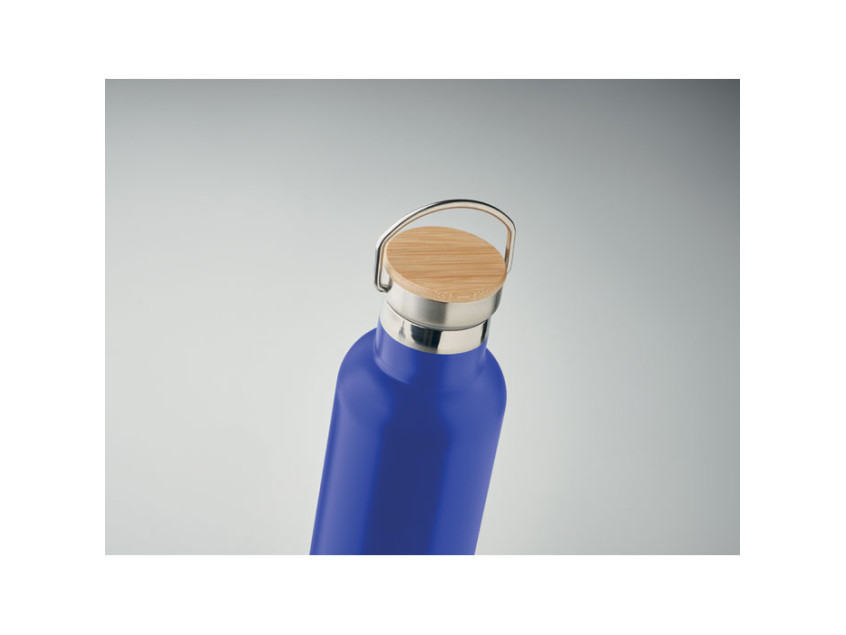 Термос с вакуумной колбой из нержавеющей стали с двойными стенками, бамбуковой крышкой и ручкой для переноски. Объем: 750 мл. Герметична.