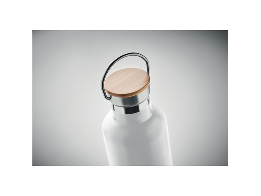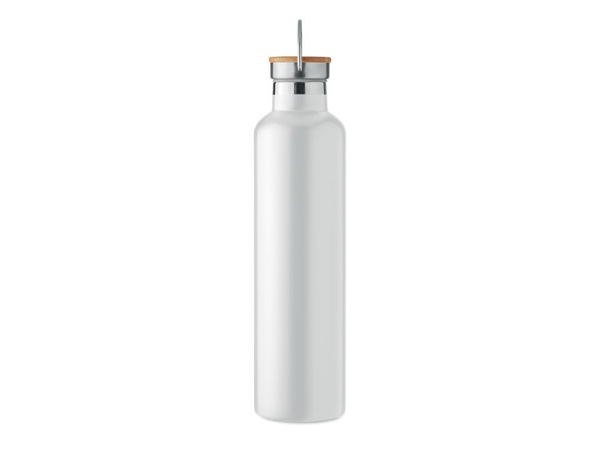 Термос с вакуумной колбой из нержавеющей стали с двойными стенками, бамбуковой крышкой и ручкой для переноски. Объем: 1 л.