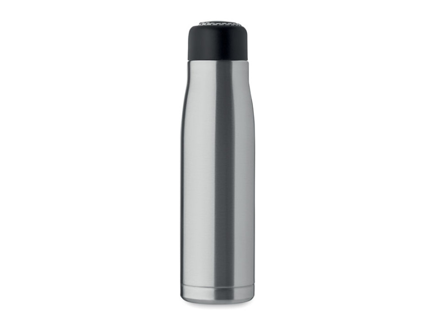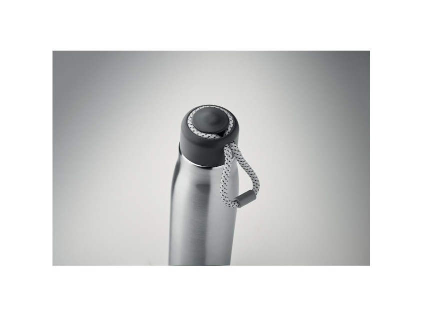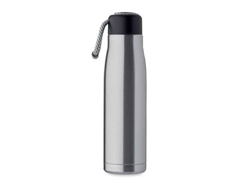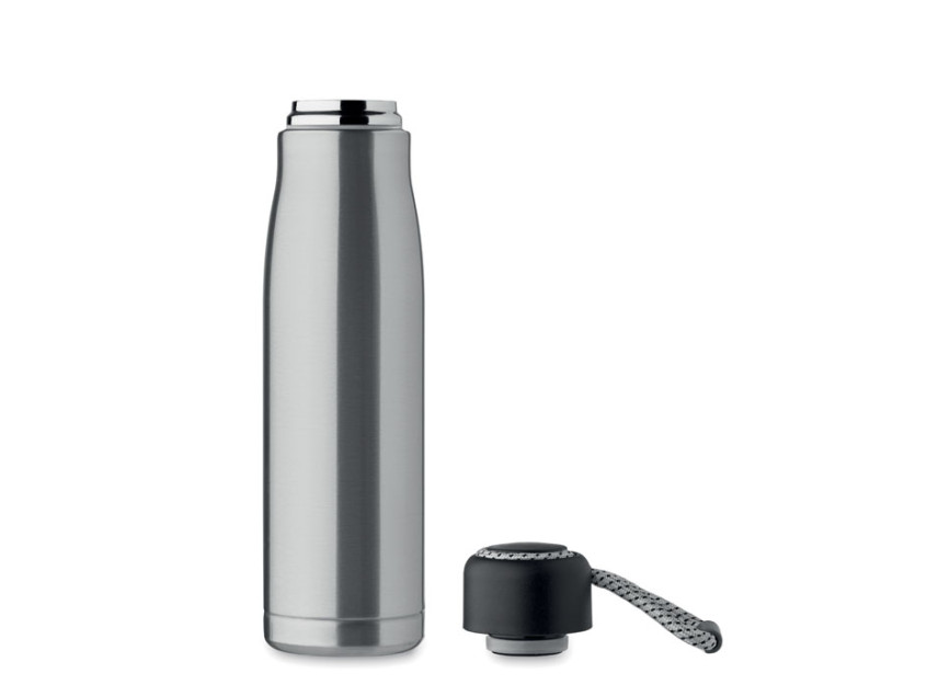 Термос с двойными стенками из 90% переработанной нержавеющей стали и 10% нержавеющей стали со шнурком-держателем на крышке из полипропилена. Герметичен. Объем: 500 мл.