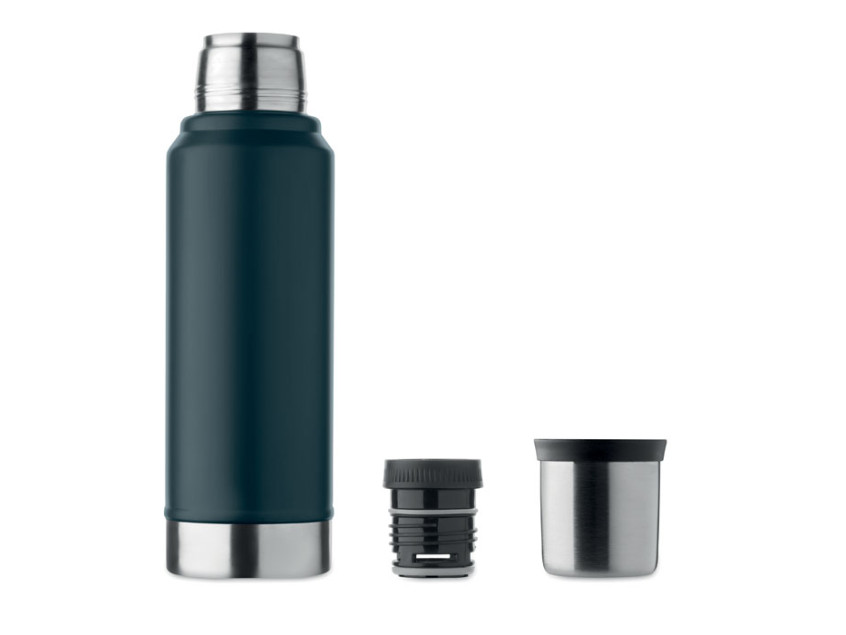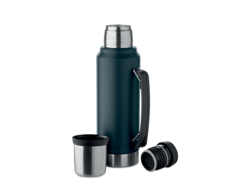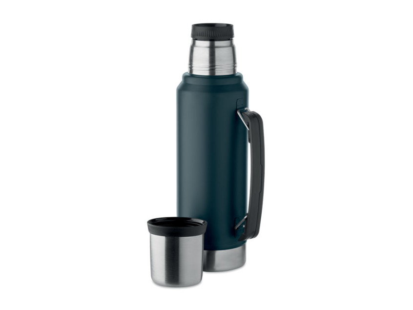 Double wall vacuum insulating bottle in recycled stainless steel (90% recycled stainless steel and 10% stainless steel) with handle on side. With PP lid and recycled stainless steel cup. Leak-free. Capacity: 1L.