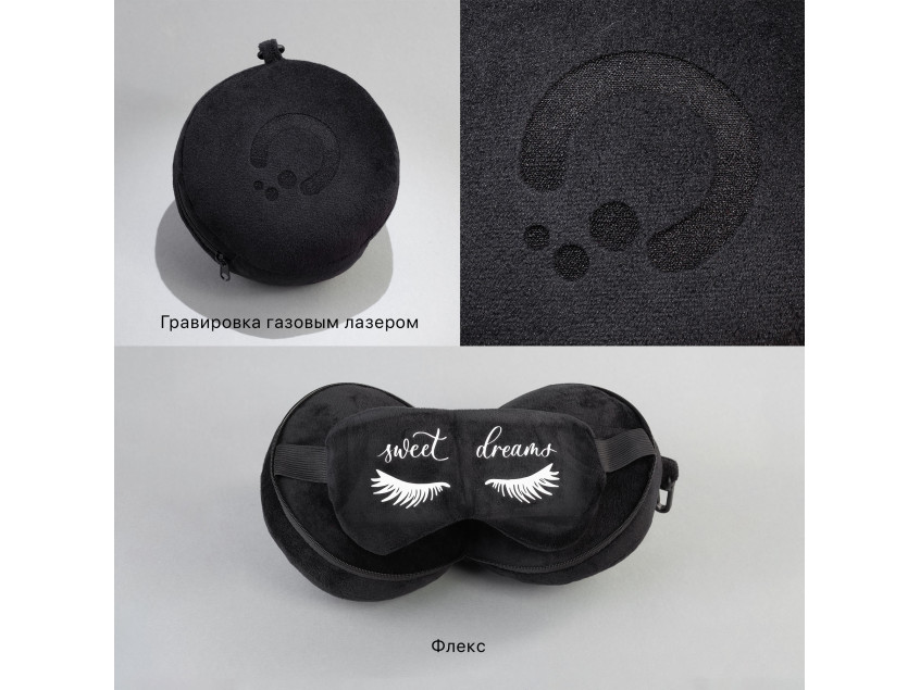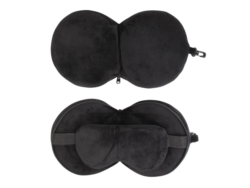 "2Go" - когда дорога в радость! Компактный аксессуар 2в1: маска и подушка для путешествий легко поместится в сумке или рюкзаке, можно использовать карабин для крепления снаружи. Практичный черный цвет.