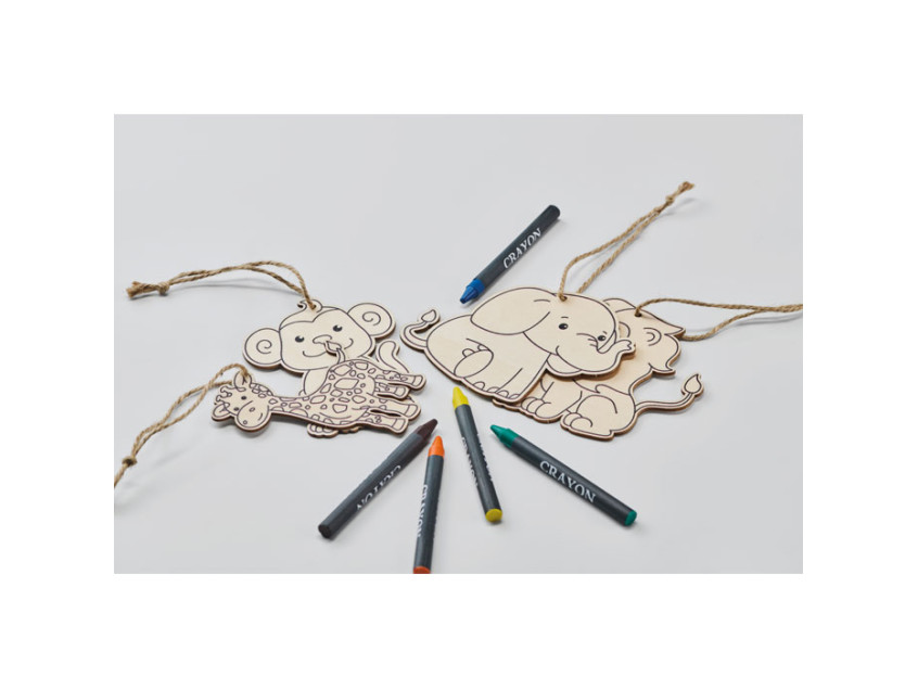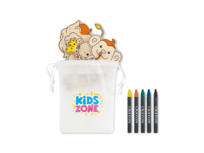 Набор для рисования: 4 деревянные фигурки с изображением животных и 5 цветных карандашей, упакованные в нетканый мешочек. Идеально подходит для творческих занятий.