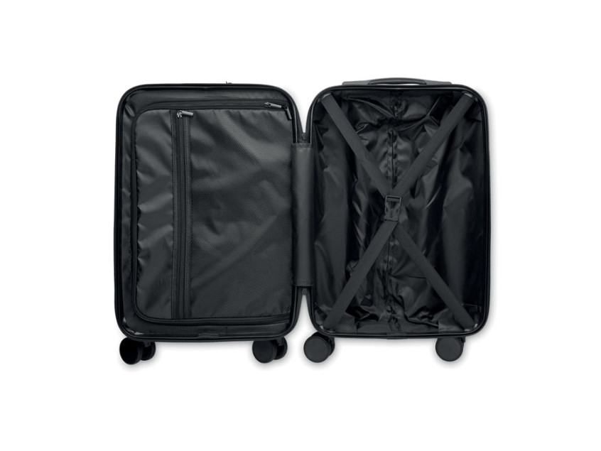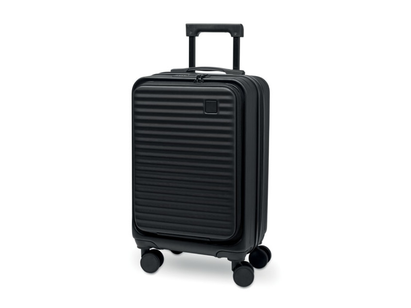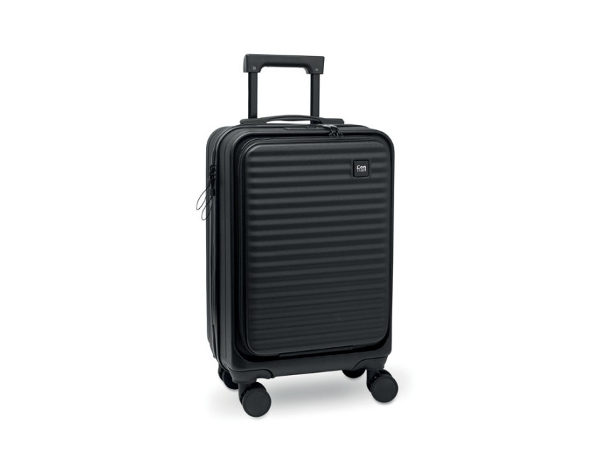 20 inch hard-shell trolley in ABS. 1 main compartment with inner compartment. Additional front zippered compartment for documents and padded 15'' laptop compartment. Includes a security lock (TSA). Rides on 4 wheels.