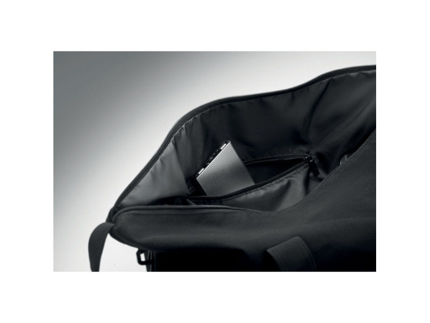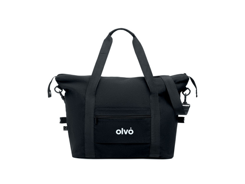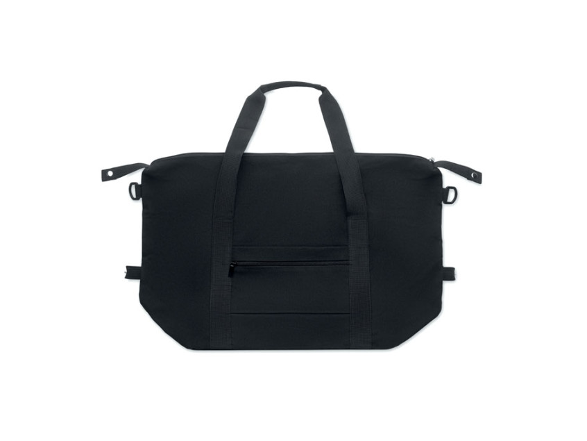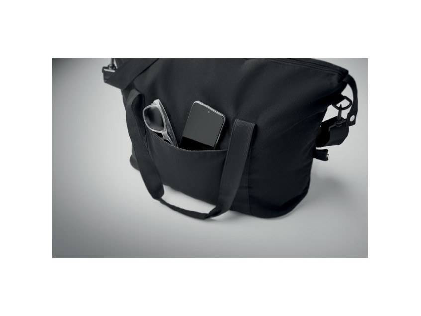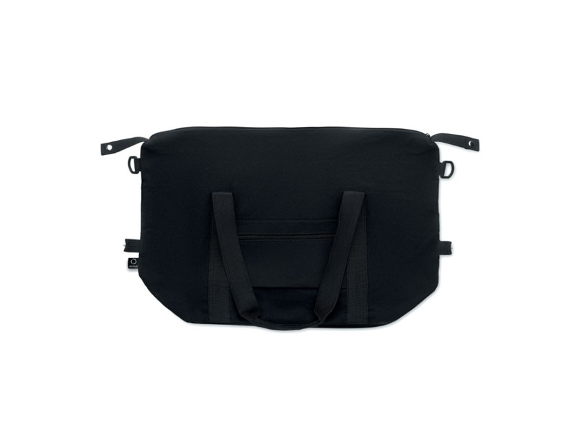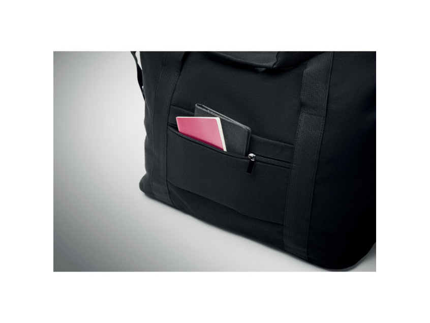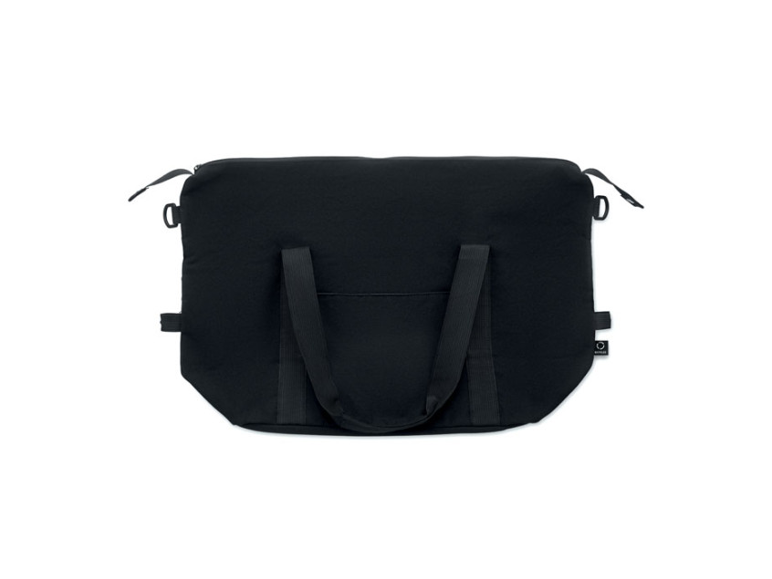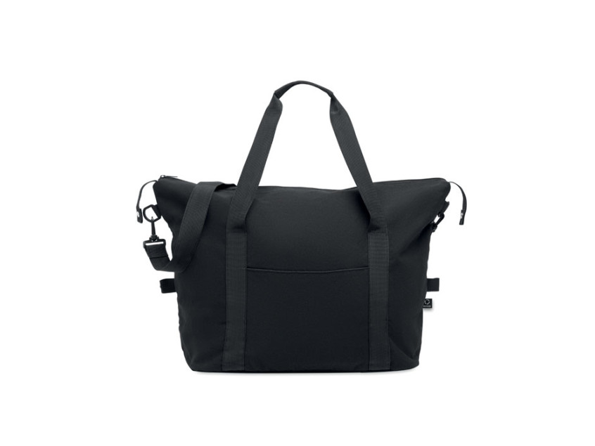 Дорожная сумка из переработанного хлопка и переработанного полиэстера (70%/30%) с подкладкой из полиэстера 210D RPET. Имеет передний накладной карман, задний карман на молнии, съемный и регулируемый плечевой ремень и мягкое дно. Крепление для чемодана на обратной стороне.