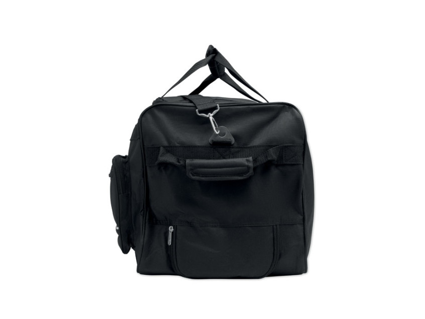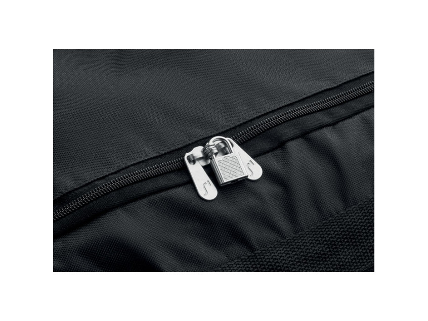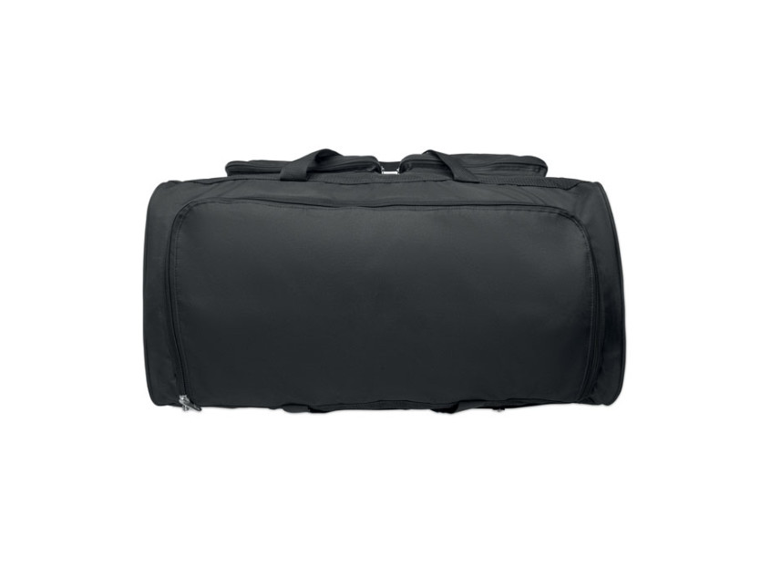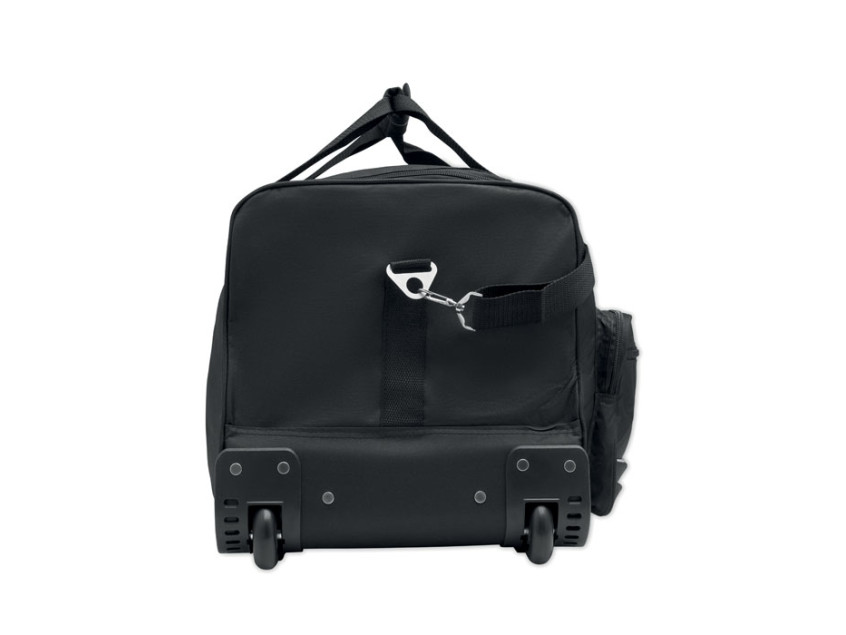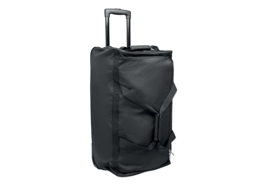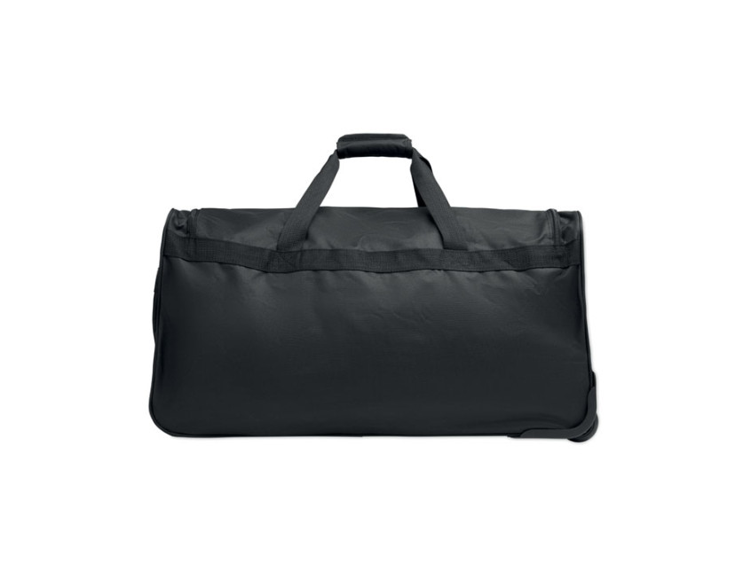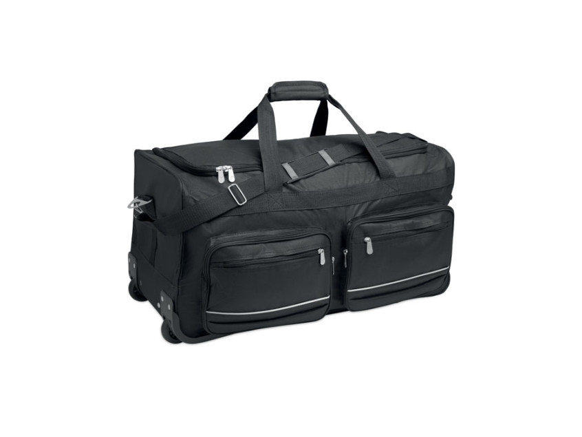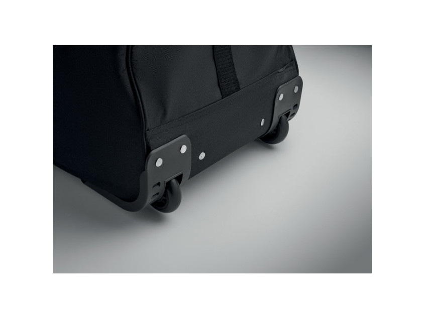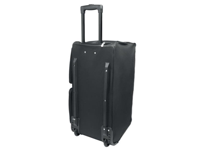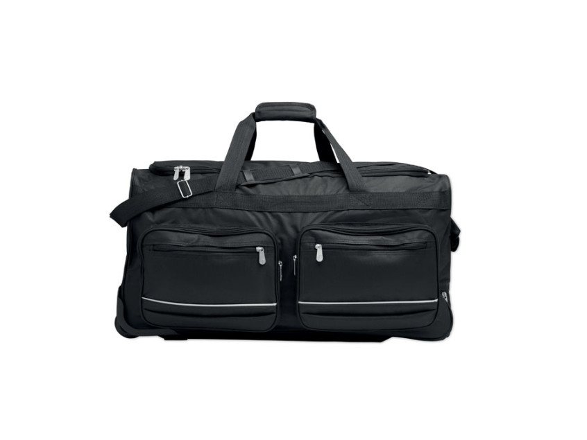 Мягкий чемодан-сумка из RPET 600D. Передний карман на молнии. Два боковых накладных кармана. Три внутренних кармана. Мягкие плечевые ремни. 2 колеса и двойная рама.