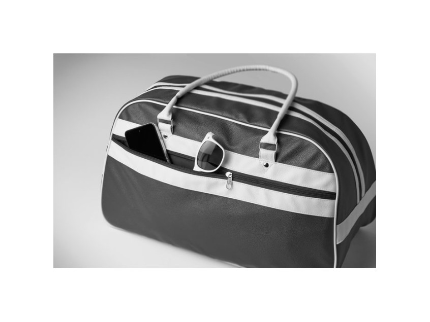 Спортивная сумка из полиуретана, с внутренней подкладкой, основным отделением и карманом на молнии, прочными ручками, жесткой вставкой в основании и заклепками. Объем около 21,5 литров.