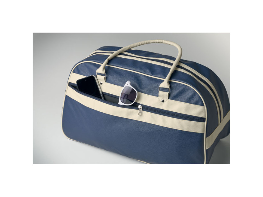 Спортивная сумка из полиуретана, с внутренней подкладкой, основным отделением и карманом на молнии, прочными ручками, жесткой вставкой в основании и заклепками. Объем около 21,5 литров.