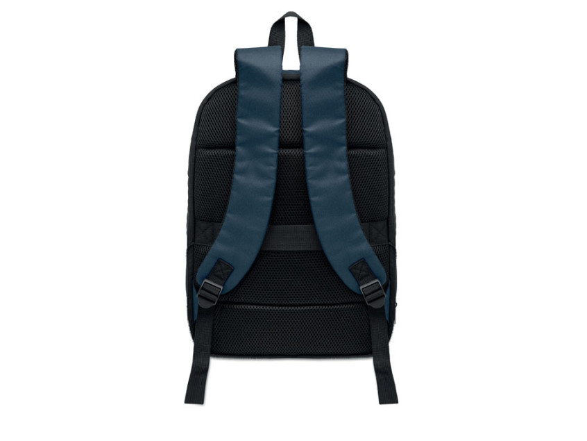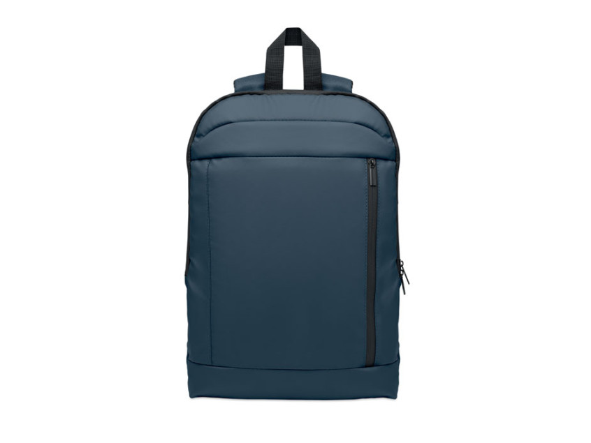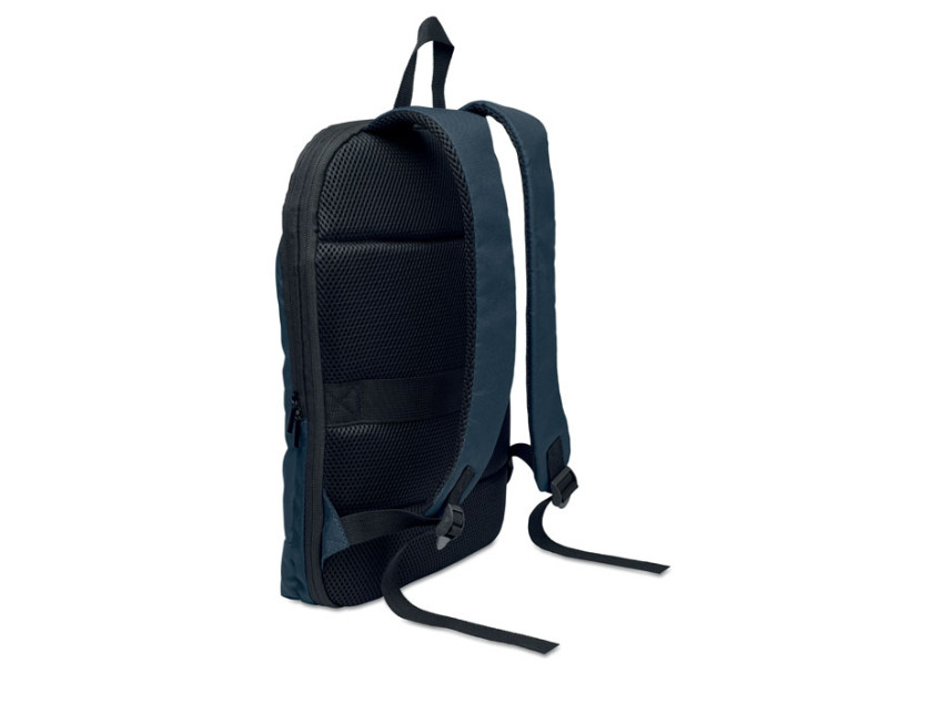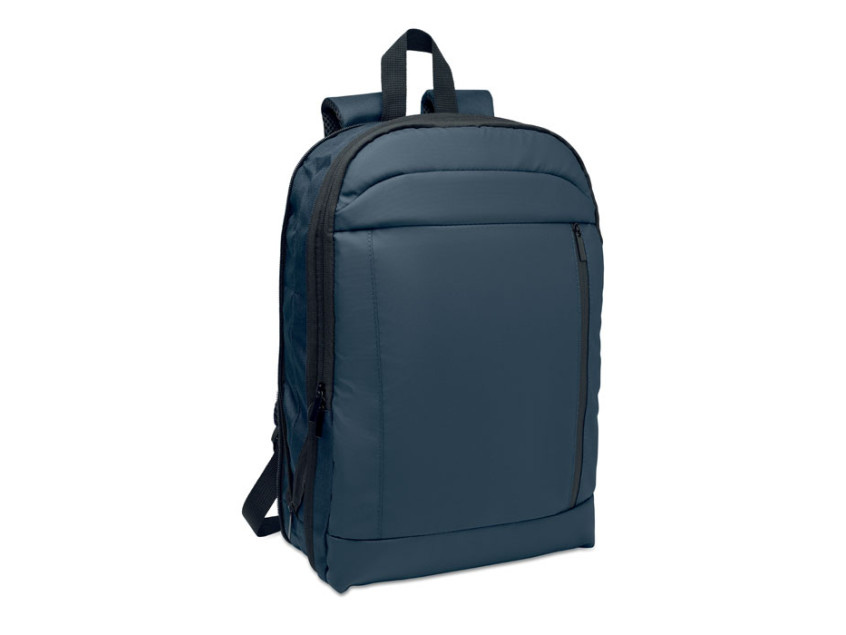 Expandable 600D RPET polyester computer backpack 16'' with PU coating on front and RPET polyester lining. Hidden zippered pocket and padded laptop compartment, front compartment, mesh back and luggage strap.