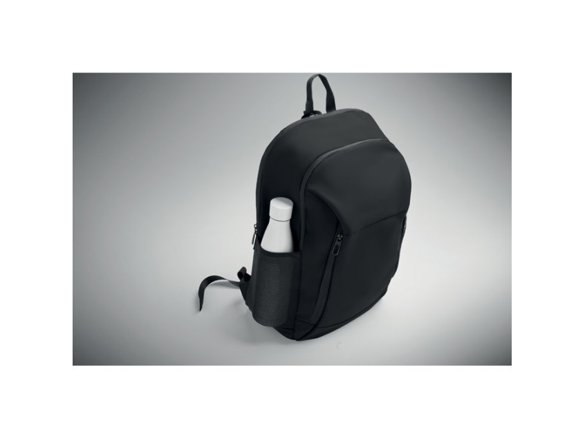 15 inch laptop backpack in soft PU with padded back and hidden zippered main compartment. 1 zippered front pocket, 2 front side zippered pockets and 2 elastic mesh side pockets. With 210D RPET lining.