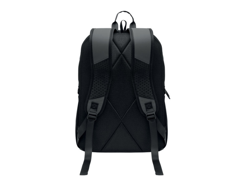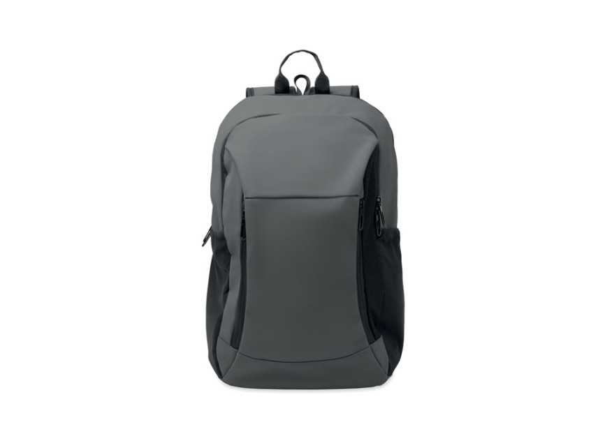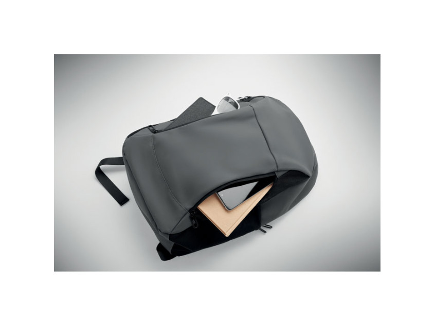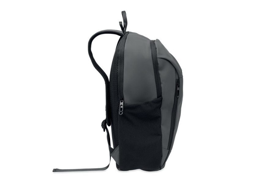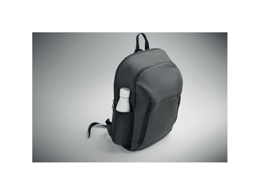 15 inch laptop backpack in soft PU with padded back and hidden zippered main compartment. 1 zippered front pocket, 2 front side zippered pockets and 2 elastic mesh side pockets. With 210D RPET lining.