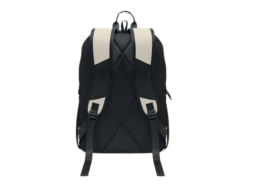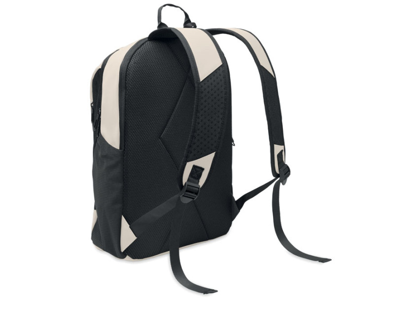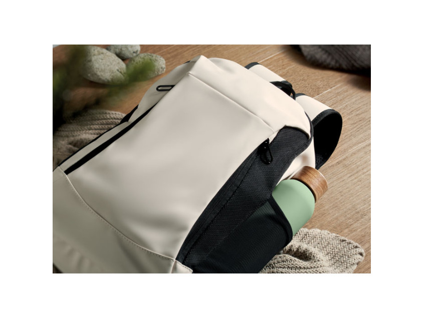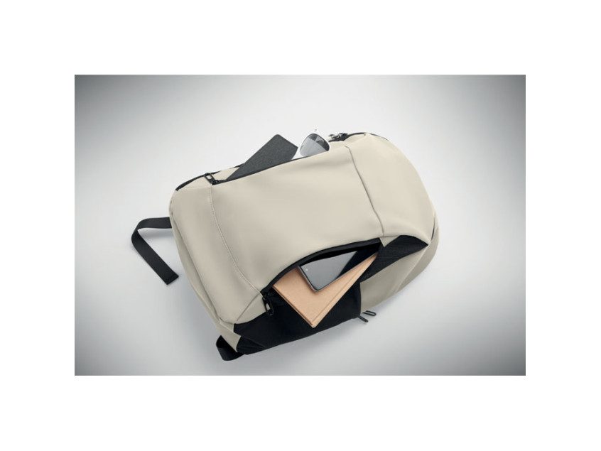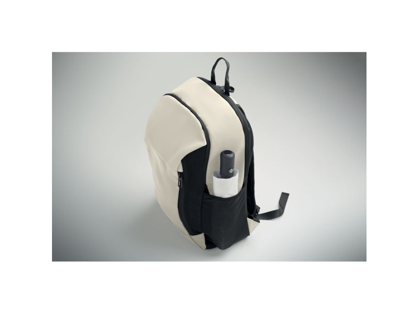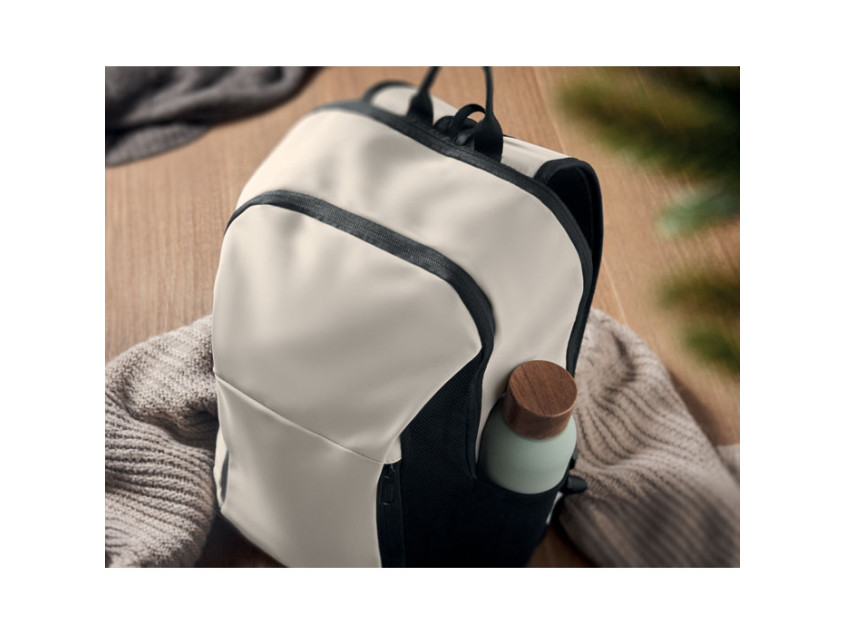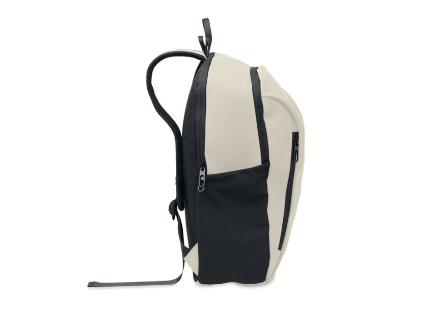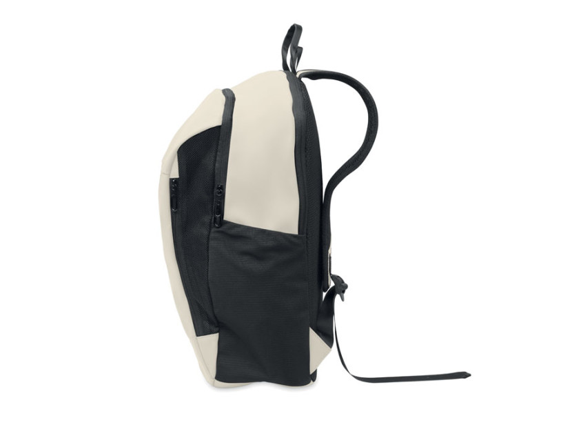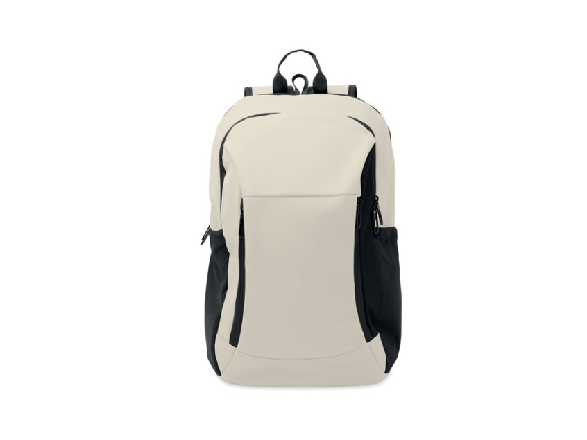 15 inch laptop backpack in soft PU with padded back and hidden zippered main compartment. 1 zippered front pocket, 2 front side zippered pockets and 2 elastic mesh side pockets. With 210D RPET lining.