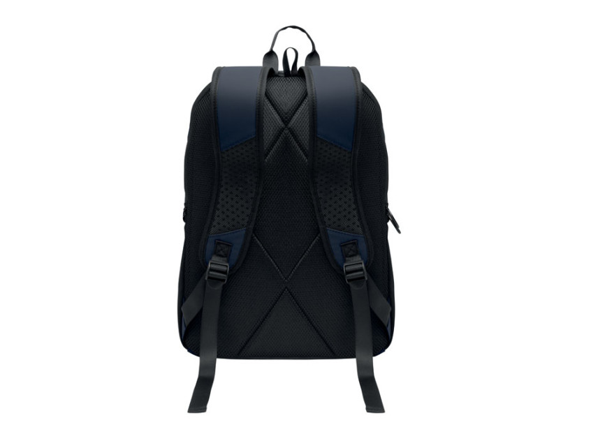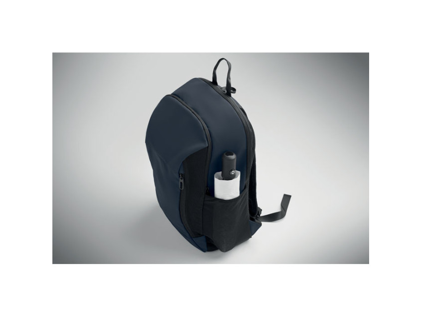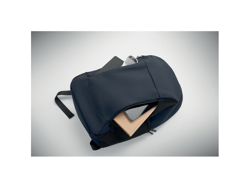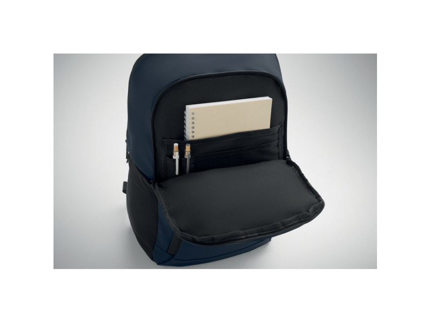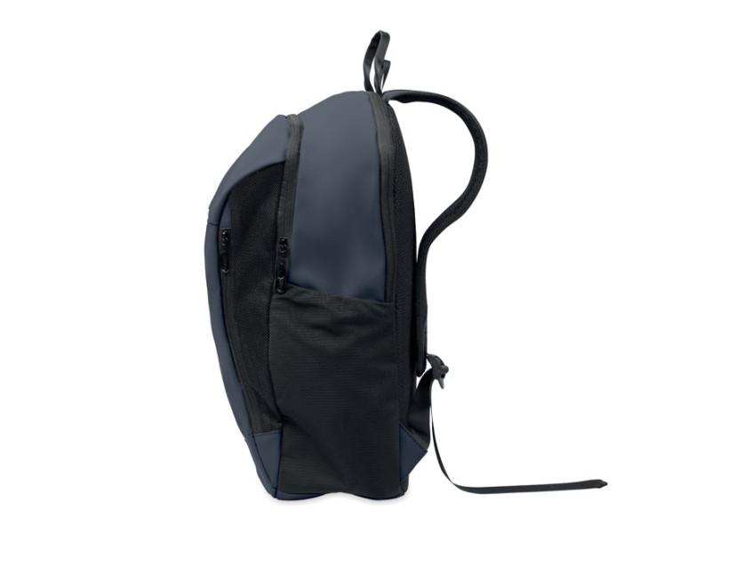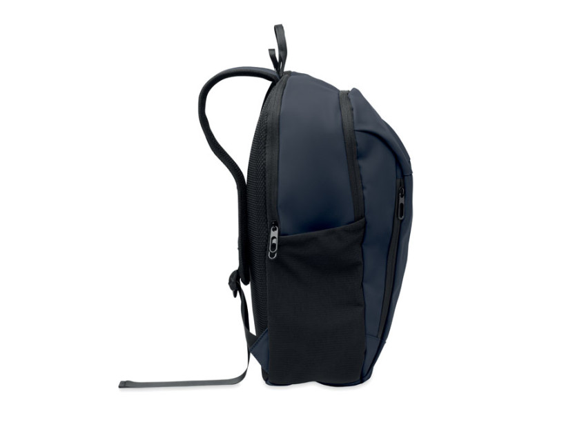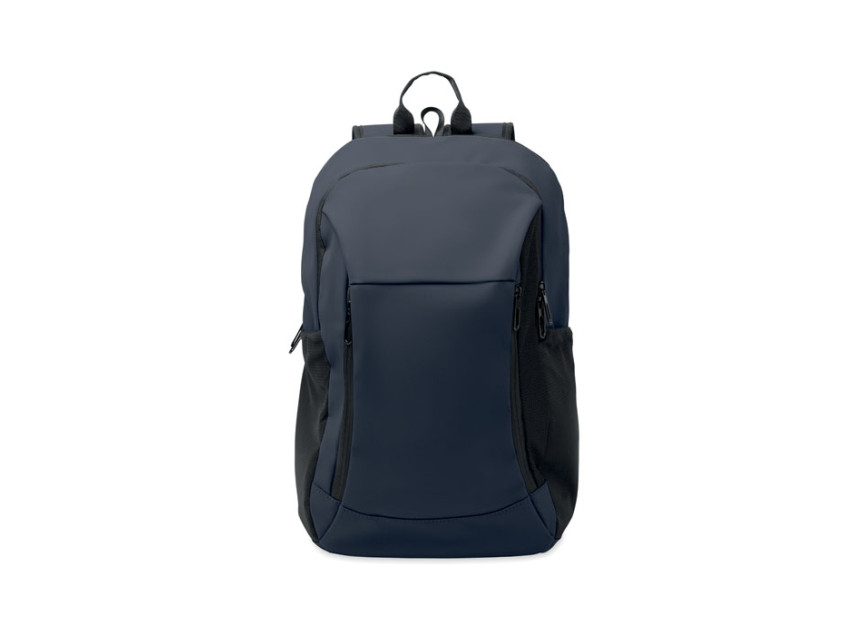 15 inch laptop backpack in soft PU with padded back and hidden zippered main compartment. 1 zippered front pocket, 2 front side zippered pockets and 2 elastic mesh side pockets. With 210D RPET lining.
