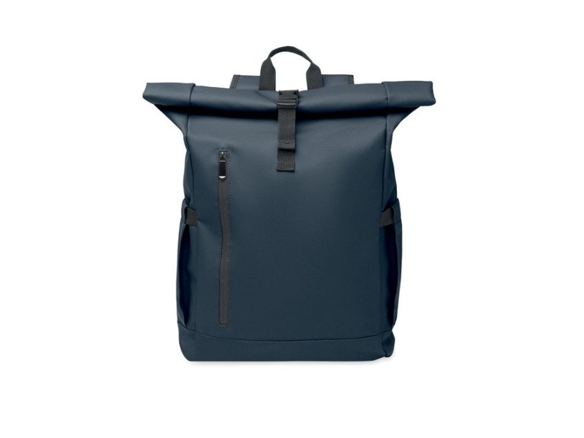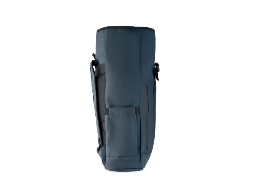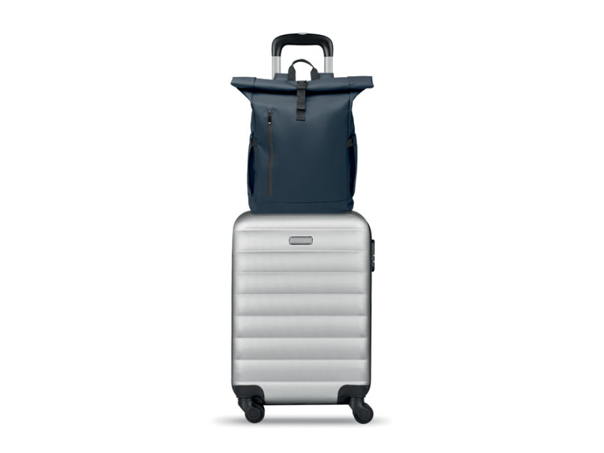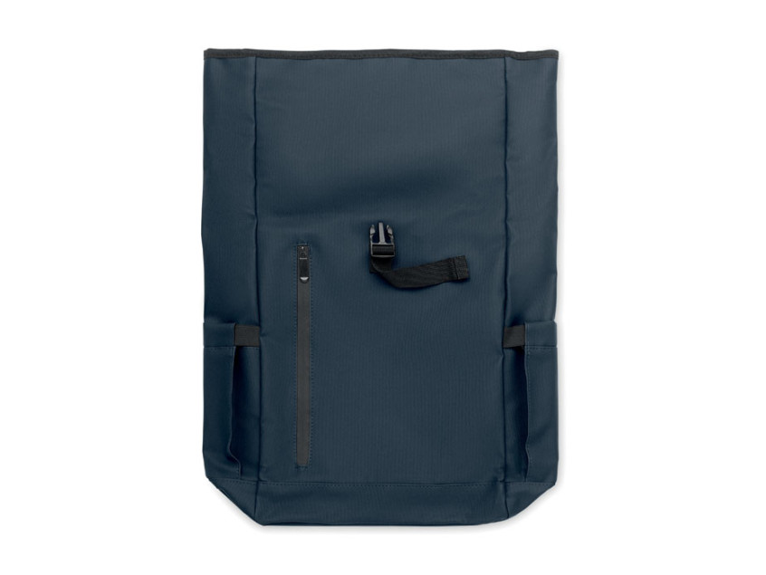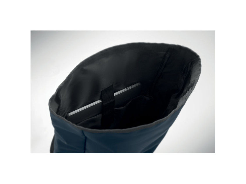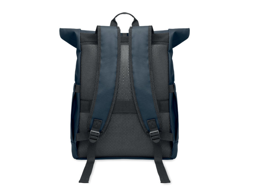 Roll top 15 inch laptop backpack in PU coated 600D RPET polyester and RPET polyester lining. Meshed padded back with zippered pocket and trolley strap. Padded shoulder strap with mesh inside finishing.