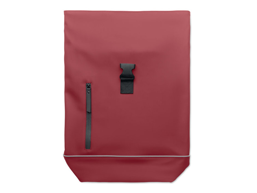 15 inch roll top laptop backpack in soft PU with padded back and base reinforcement with reflective strip. Waterproof zippered front pocket. 210D RPET polyester lining.