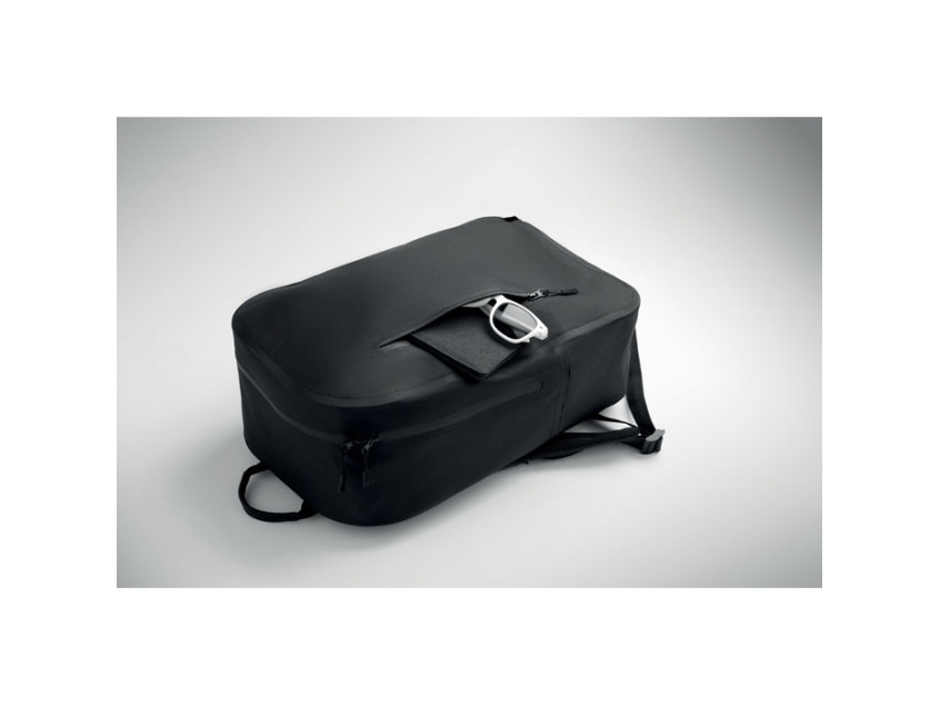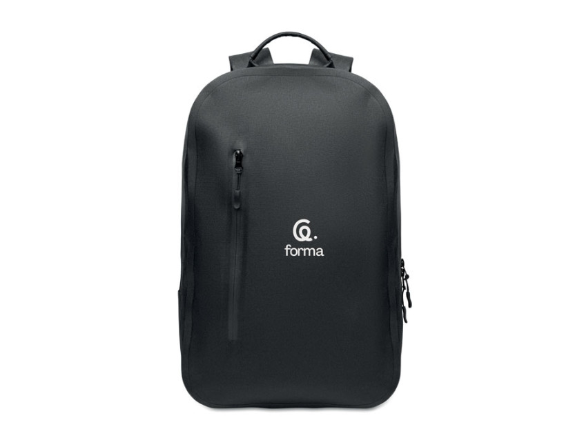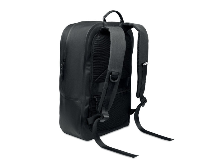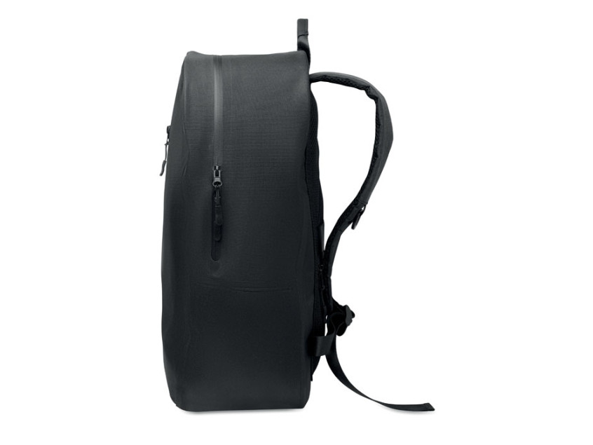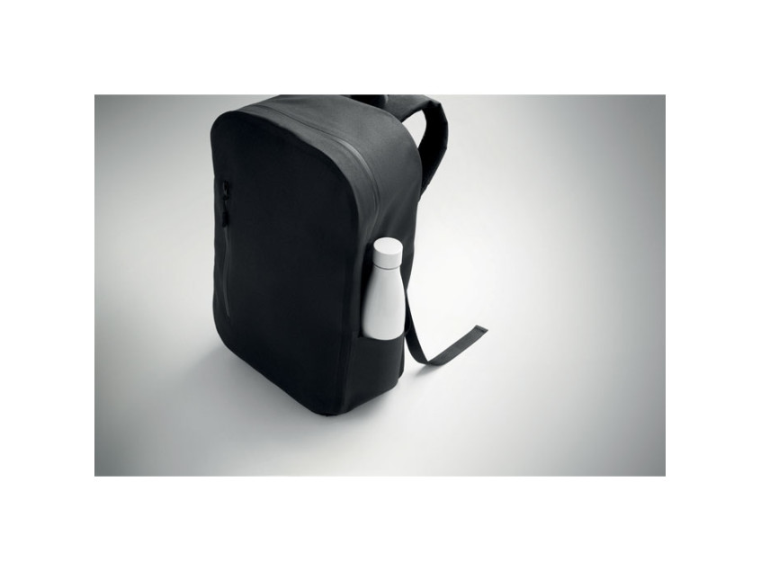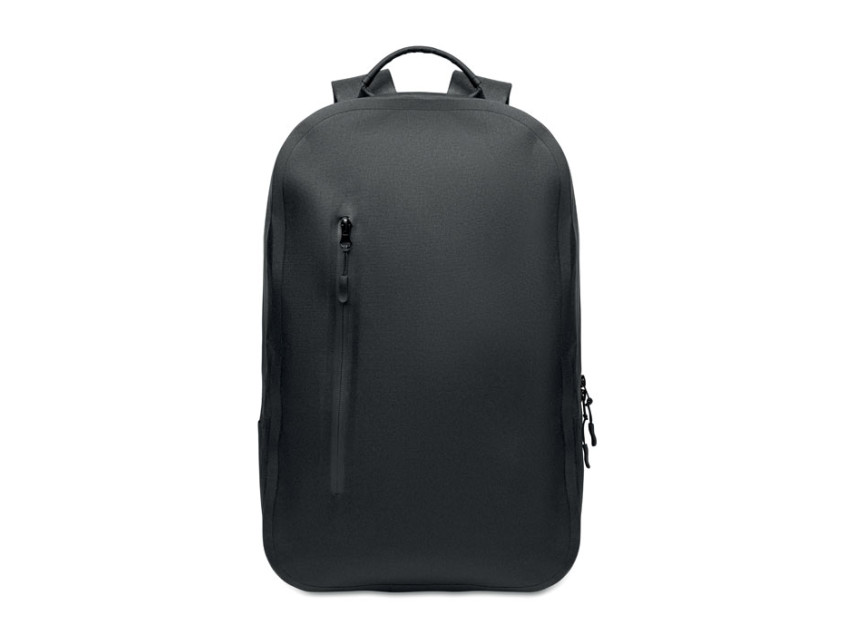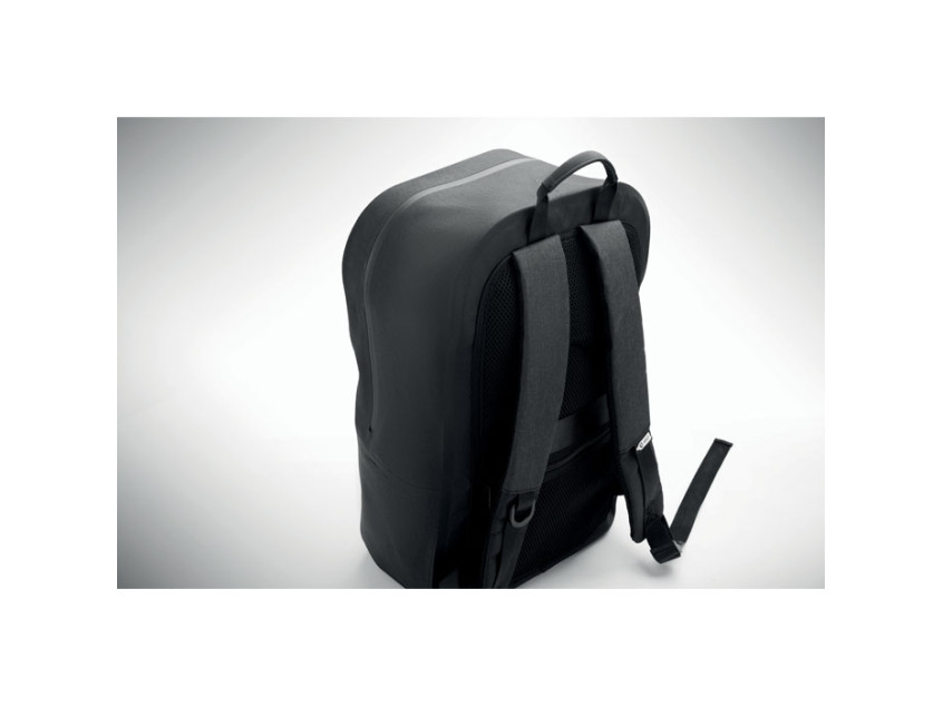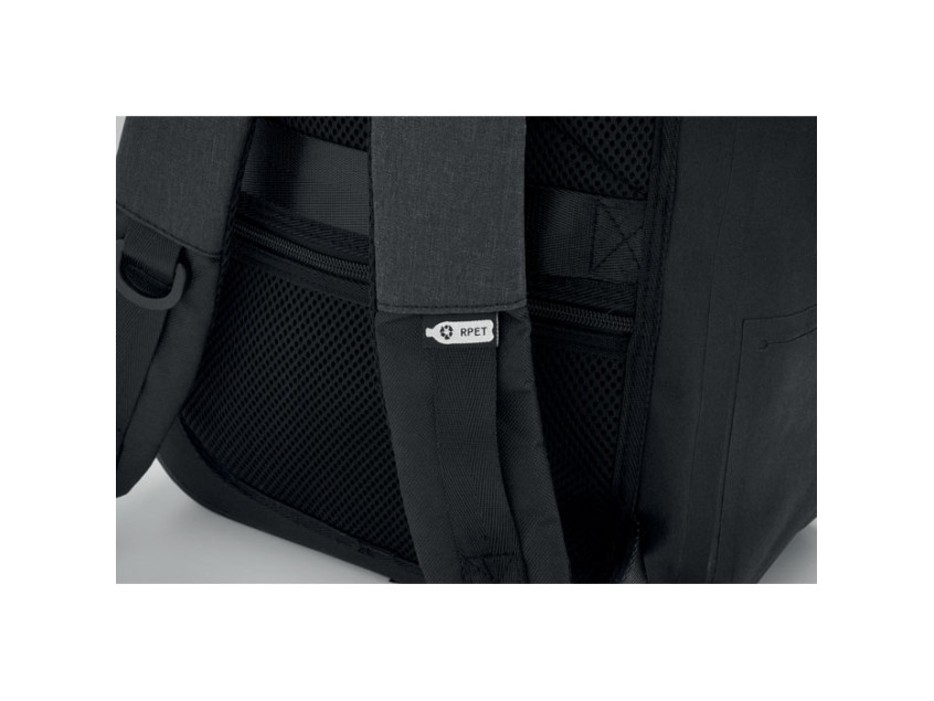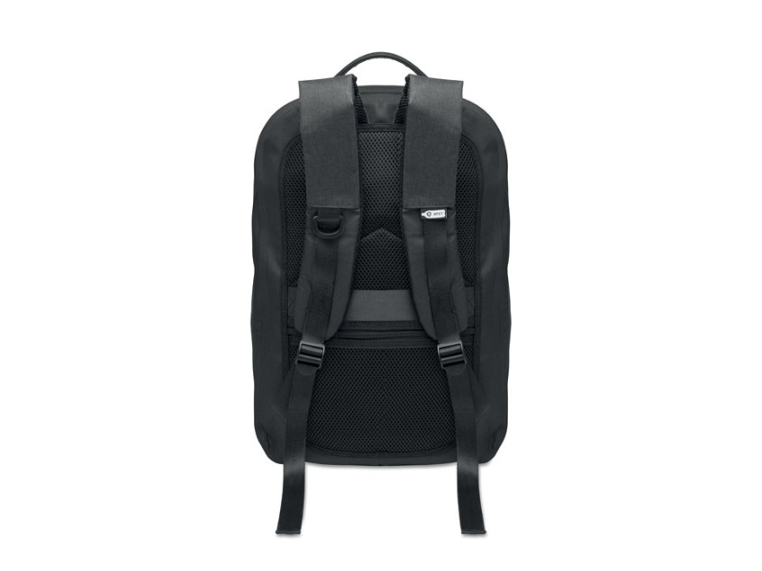 Laptop backpack 16'' in 300D RPET polyester and 210D polyester lining. Water-resistant fabric. Hidden zippered pocket and trolley holder on the back. Padded internal laptop compartment, mesh back and shoulder strap.