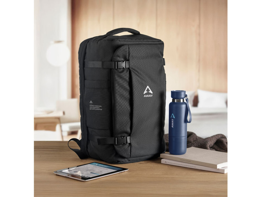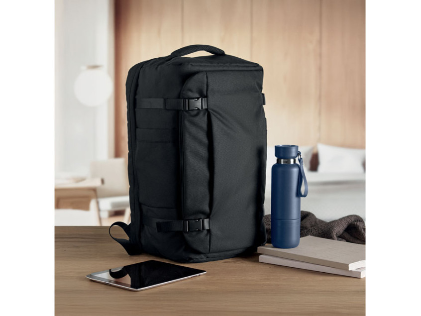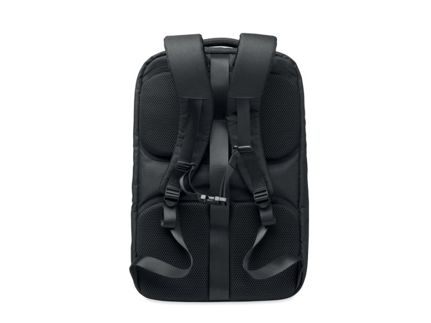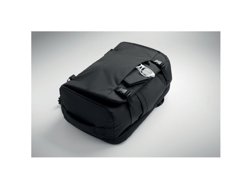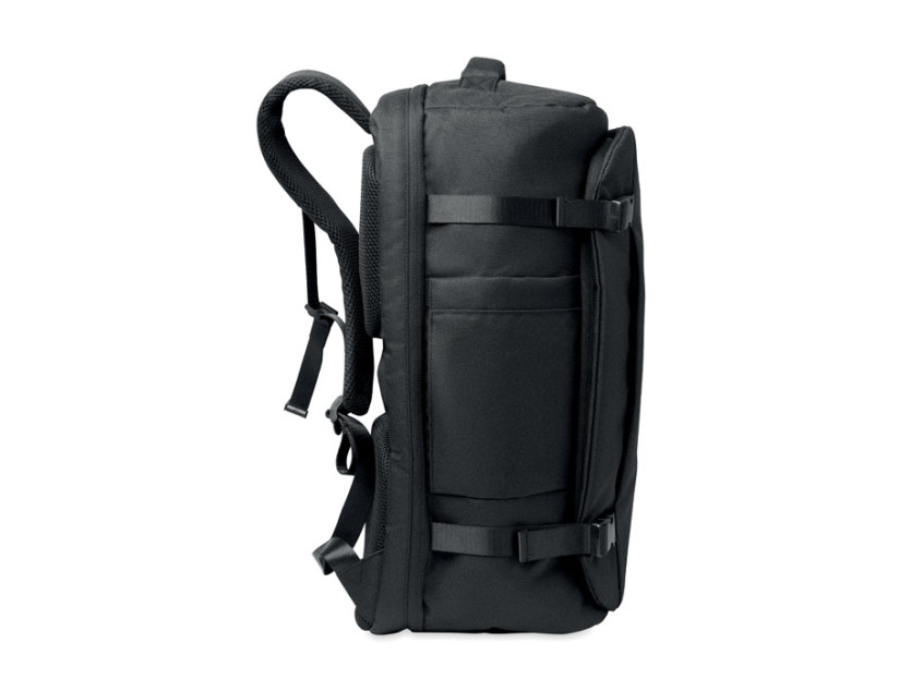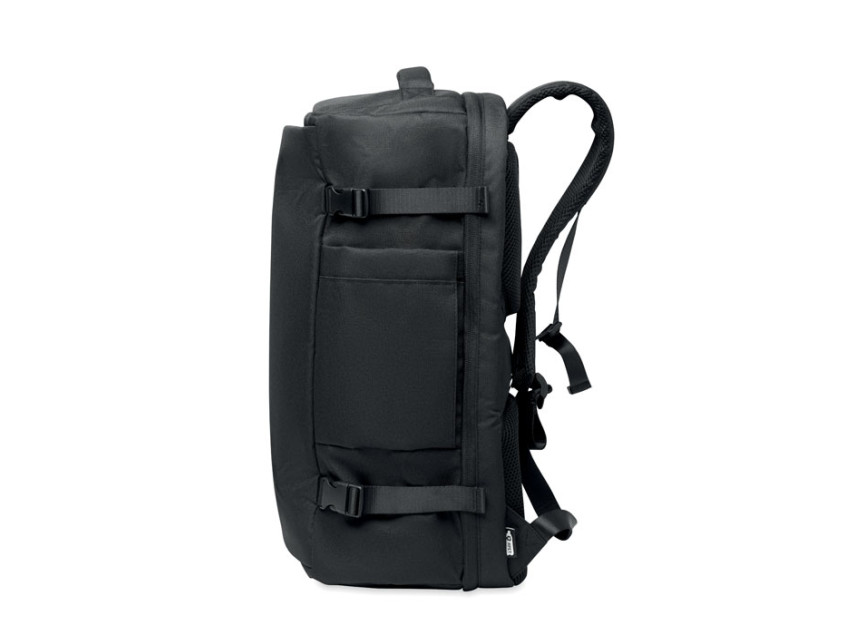 Large travel 17 inch laptop backpack in 600D RPET polyester. Features several compartments as one main for clothes, two padded for laptop, tablet and more. Padded back panel, shoulder strap, hand grip.