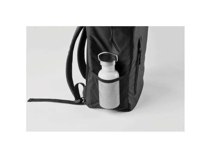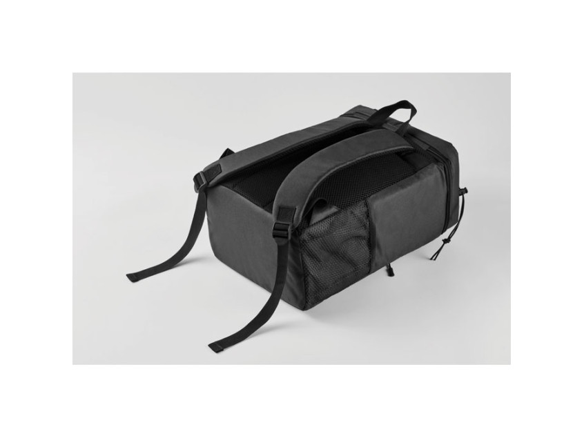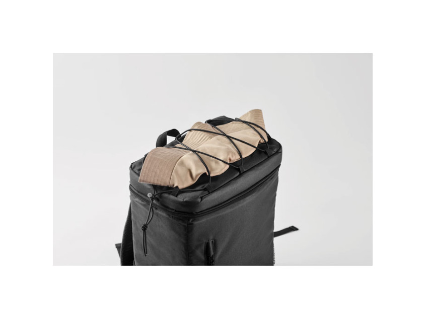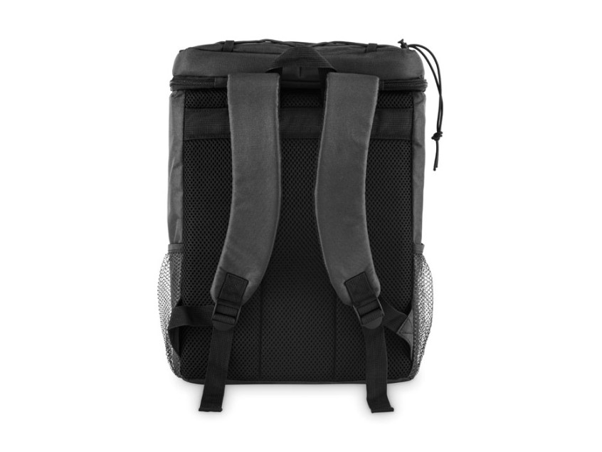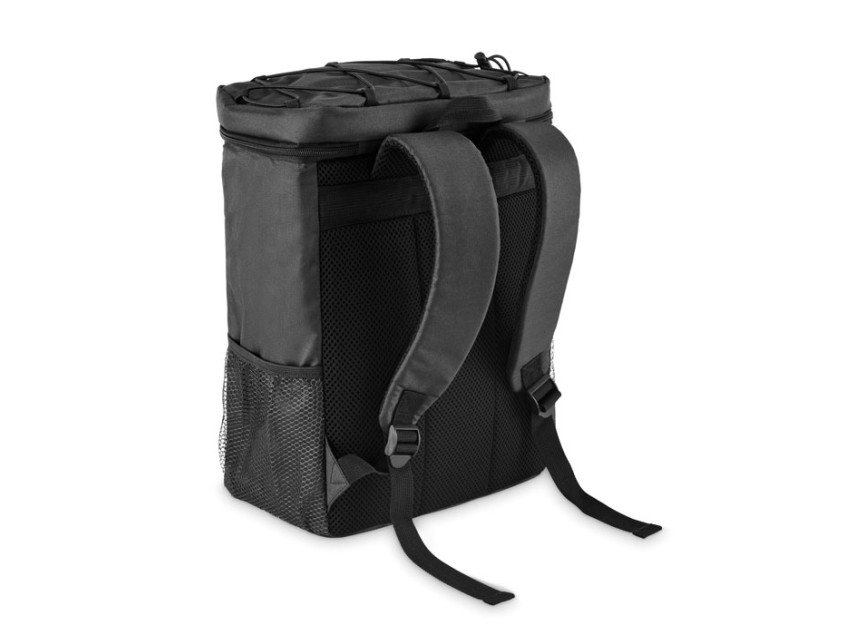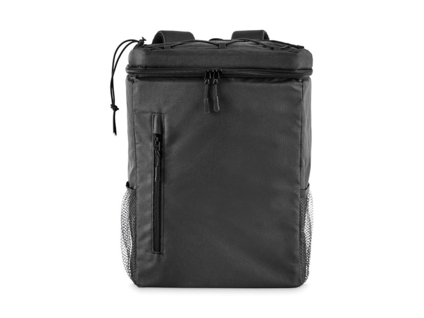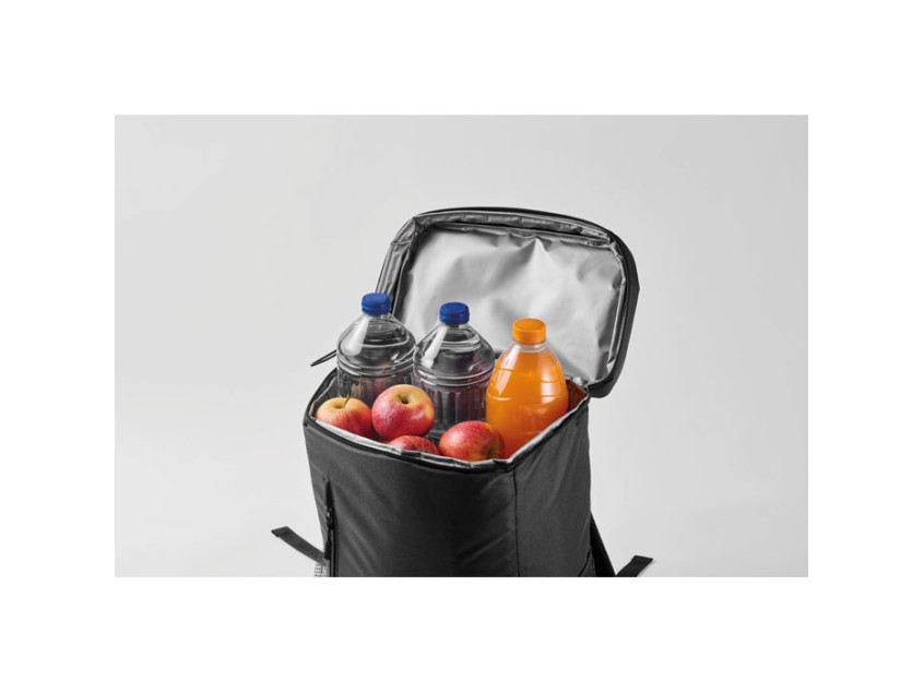 Рюкзак-холодильник из полиэстера RPET 600D с мягкими регулируемыми плечевыми ремнями, подкладкой из PEVA и пенополиэтиленовой изоляцией толщиной 5 мм. Имеет передний карман и два боковых сетчатых кармана. Объем: 9 л.