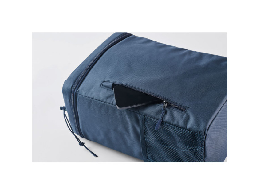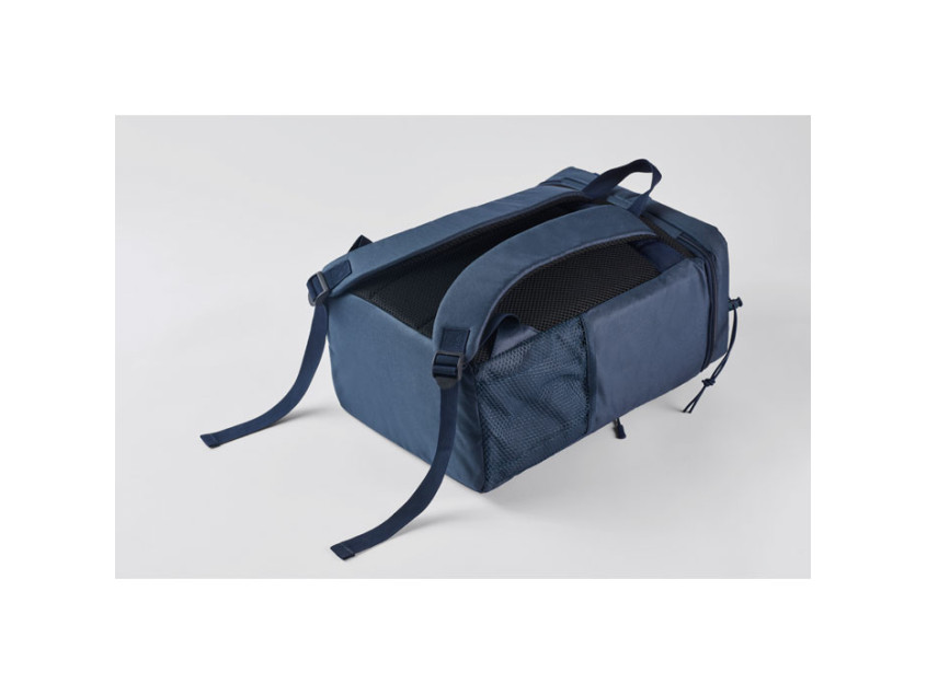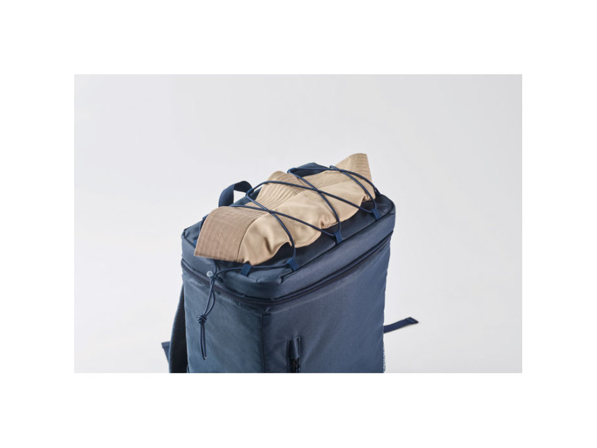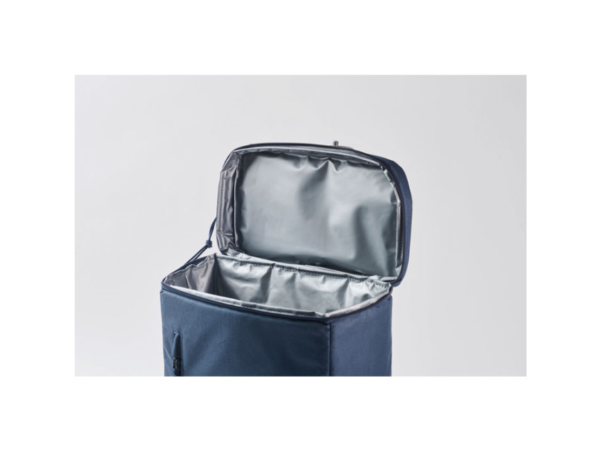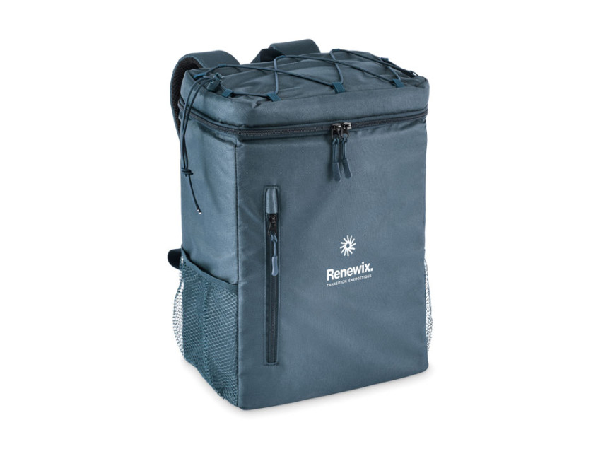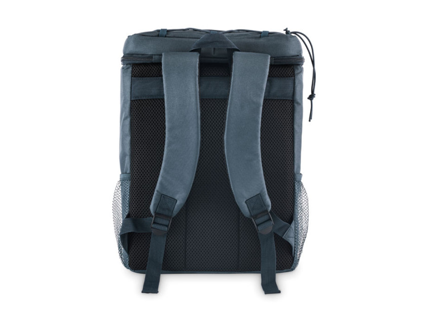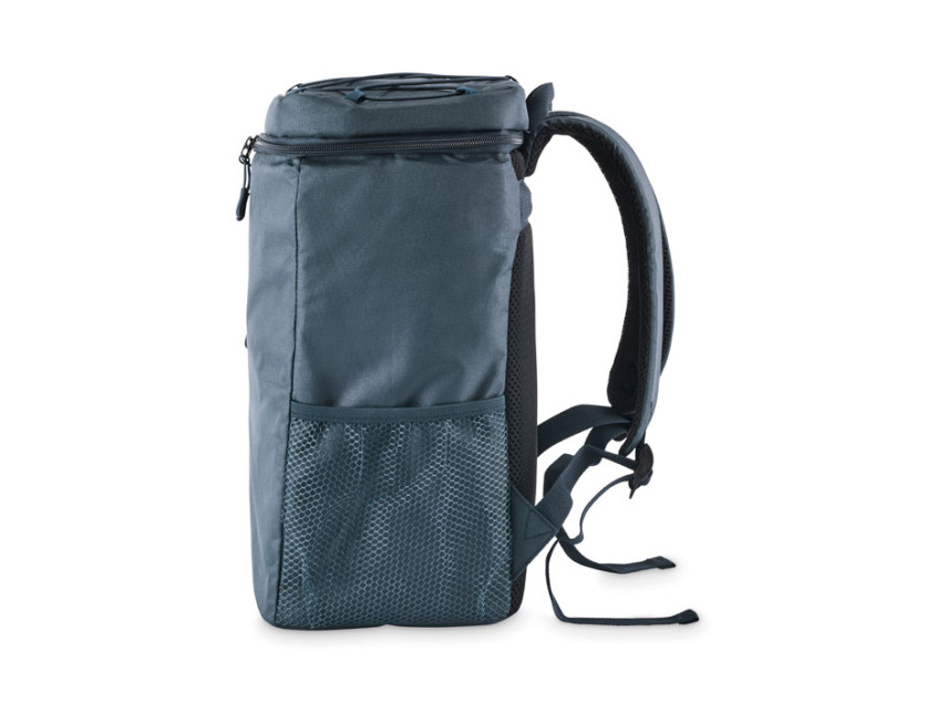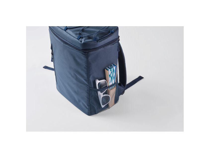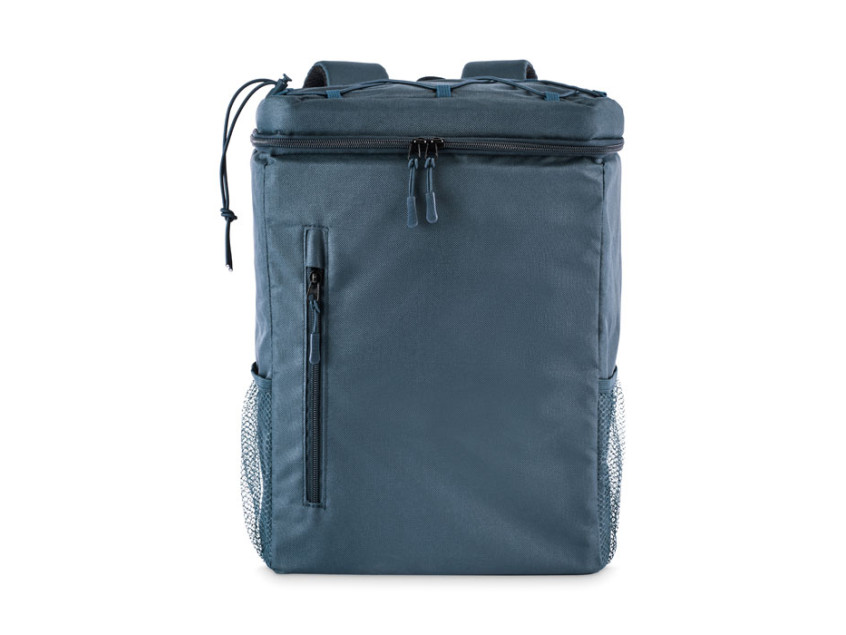 Рюкзак-холодильник из полиэстера RPET 600D с мягкими регулируемыми плечевыми ремнями, подкладкой из PEVA и пенополиэтиленовой изоляцией толщиной 5 мм. Имеет передний карман и два боковых сетчатых кармана. Объем: 9 л.