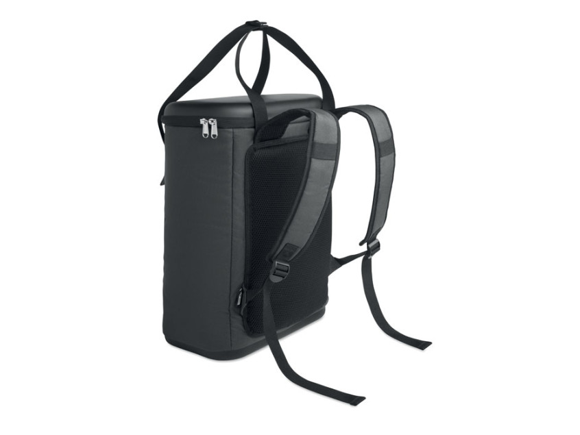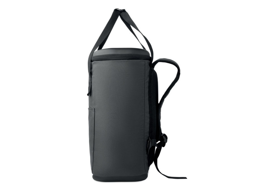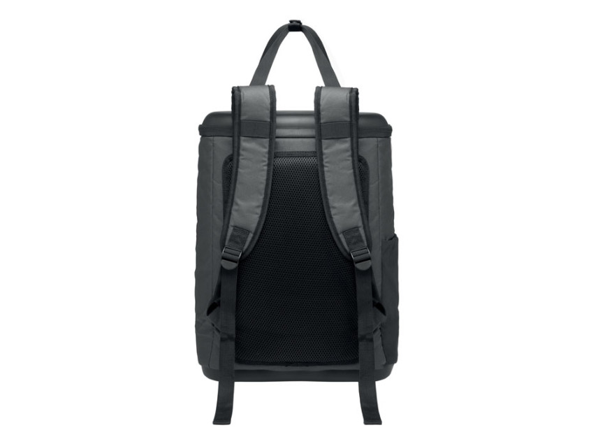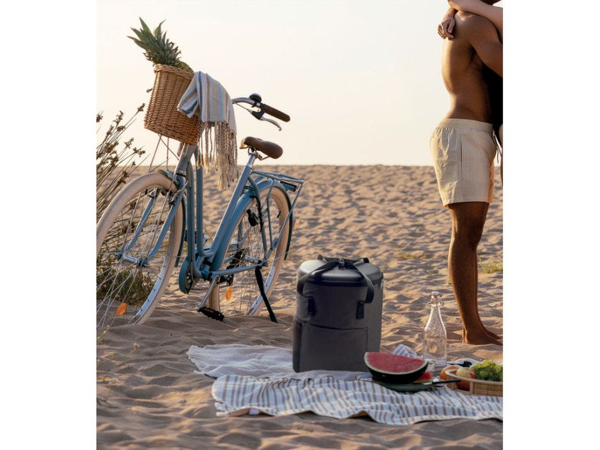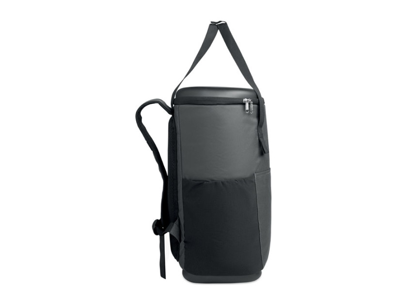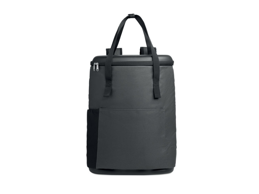 Рюкзак-кулер из водоотталкивающего полиэстера 600D с пенополиэтиленовой изоляцией и подкладкой из PEVA. Формованная крышка, мягкая сетчатая спинка, передний карман на молнии и боковые сетчатые карманы. Объем 20 л.
